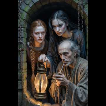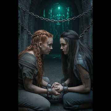Gothic industrial metal soundtrack with a dark prison atmosphere, heavy and oppressive, medium tempo with a steady crushing groove, Downtuned distorted guitars playing slow dissonant chords and dark industrial metal riffs, Saturated electric cello for deep melodic lines and haunting textures, Metallic percussion made from chains, iron bars, and industrial impacts creating a prison-like rhythm, Continuous sub-bass drone and dark ambient layers, Deep male monastic choirs in the background, distant and cavernous, Reverberated industrial noises and metallic echoes create the feeling of being trapped in a vast underground fortress, Vocals: two female voices with anxious, emotional singing, trembling tone expressing fear and tension, sometimes whispered or breathy, One extremely deep male voice, dark and sinister, villain-like, slow and machiavellian spoken lines, Overall mood: claustrophobic, gothic, cinematic industrial metal with ritualistic atmosphere and oppressive tension