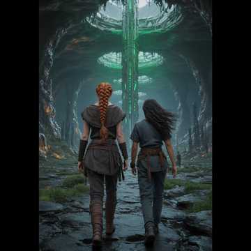 Guitars: aggressive melodic death metal tremolo picking, tight palm-muted riffs, drop C tuning, sharp harmonized leads, fast melodic runs, Drums: powerful double kick patterns, fast grooves, occasional controlled blast beats, Folk & orchestral elements: rapid baroque harpsichord doubling guitar melodies, dark hurdy-gurdy drones, low cello stabs, subtle ethnic percussion, and eerie alien synth pulses and digital textures layered in the background, Vocals: dual female vocals, One strong clean rock voice, powerful and determined; the other operatic soprano, soaring melodic lines creating contrast and epic tension, Structure: atmospheric alien intro with harpsichord and synths β explosive guitar entrance with tremolo riffs β alternating vocal intensity