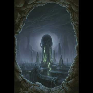 metal, Immersive cinematic ambient score with male-leaning choir textures; begins in near-silence with distant sub pulses and filtered drones drifting left-right in slow arcs, Gradually introduces warped aquatic FX, alien swells, and sparse low strings; midway, discreetly layered distortion guitars emerge, tremolo-picked in the distance, widening into a tense stereo field, Final third blooms into dense, evolving textures with choral pads, aggressive yet buried death-metalβflavored lines, and surging impacts that crest then decay into a cold, lingering tail, strong, experimental, ambient, death metal, minimal, deep
