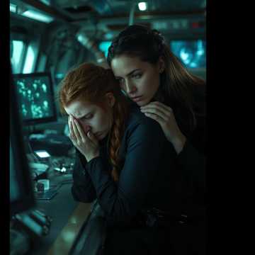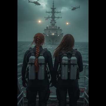 Abyssal Cinematic Progressive Metal β Heavy 8-string guitars with deep palm-muted riffs and reverb-soaked arpeggios, fretless bass with sliding drones, hybrid drums (deep acoustic kit + distorted electronic percussion), granular synth pads evoking ocean currents, Dark orchestral layer: legato cellos and double basses, low brass swells, harp and prepared piano with reverse delays, Taiko drums for impact, Submarine ambience: hydrophone recordings, deep whale calls, metallic cable creaks, filtered long-tail reverbs, Multi-layered vocals: Gregorian male choirs, soaring female opera, warm mezzo leads, occasional deep growl, stereo whispers for secret moments, Fluid transitions between solemn political tension and intimate, playful relief, Outro fades into deep drones, submerged choirs, and sonar echoes disappearing into the abyss