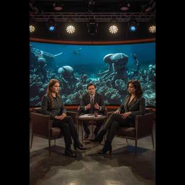 Epic progressive symphonic metal with cinematic depth, blending underwater mystery and theatrical surface show, Underwater parts: massive orchestral strings, deep cellos, Gregorian choirs (bass + ethereal sopranos), ocean ambience (abyssal rumbles, waves, distant ship bells), sustained E-Bow guitars, subtle glitch textures, Surface parts: powerful theatrical male vocals like an opera showman, bright brass (trumpets, horns, trombones), jazzy-to-progressive drums, Hammond organ flourishes, Female vocals: soft and airy for Helena, warm and assertive for Scorti, Alien choirs: wordless harmonics, human/processed blend, Smooth transitions between abyssal choral sections and bold TV-show energy, climax where both worlds merge, ending with ocean fade-out, Experimental, brutal switchs between different ambiances