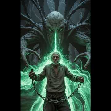 Cinematic medieval dark fusion with alien horror atmosphere, Deep male vocal, low-pitched, intimate close-mic delivery, emotional, haunted tone, slow vibrato, whispers and powerful rises, Mood: mysterious, tragic, hypnotic, ominous yet captivating, Intro in 6/8: ambient drones, medieval choir, bowed strings, hurdy-gurdy, distant bells, alien textures (glitch, reversed echoes), Gradual build, Verses in 5/4: clean arpeggiated guitars (drop D), subtle tremolo, minimal percussion, heartbeat kick, dark cello lines, Chorus shifts to 4/4: progressive metal energy, distorted guitars (drop C), heavy but controlled riffs, layered harmonics, double kick patterns (not constant blast), cinematic impact, Bridge: stripped ambient, whispers, alien pulses, Instruments: electric + acoustic guitars, cello, hurdy-gurdy, low choir, analog synth pads, metallic FX, Dynamic structure: calm β tension β powerful β haunting resolution