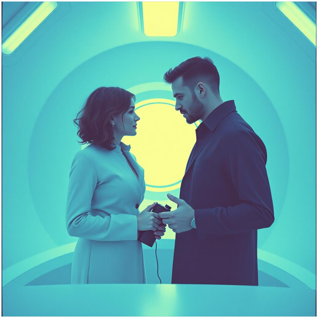 Tense, cinematic sci-fi drama, Electronic, atmospheric, dark, Four alternating leads with clear character voices, Song structure with scene changes, dialogue-like verses, tense group choruses, suspenseful instrumental breaks, Strong contrasts, emotional build-ups, and pauses for dramatic effect