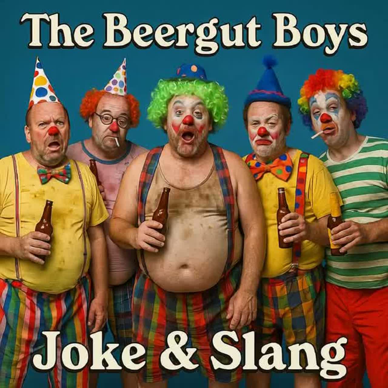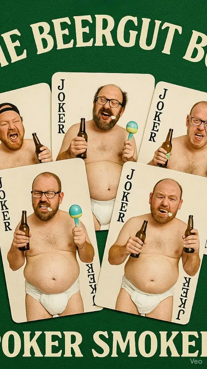 Boy band with multiple lead vocals and rich backing harmonies, Comedic tone with over-the-top emotional delivery, Mid-tempo groove with funky basslines, hand claps, and synth stabs, Playful vocal stacking and exaggerated falsettos, Jazzy chords with 2000s pop structure, Polished mix with layered group vocals and goofy sound effects (hiccups, burps, baby rattles), Greasy garage-pop meets barbershop chaos, Must feel like a beer-fueled sing-along gone wrong at a suburban poker night, ‑Female vocals