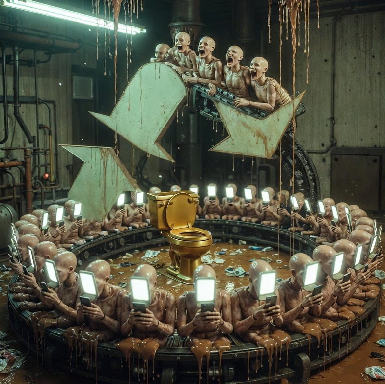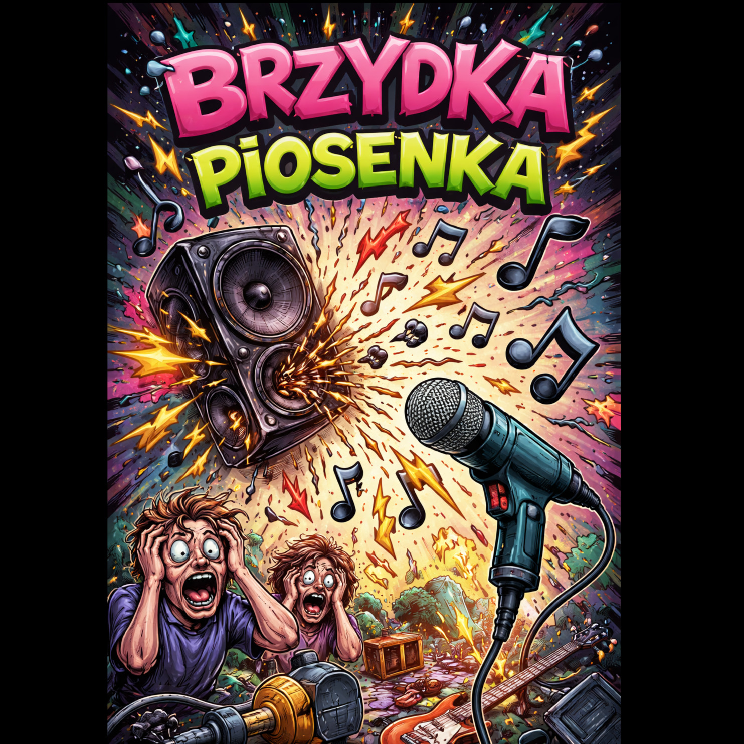 Doom metal, Experimental noise song, Total chaotic cacophony of sounds: dissonant instruments, out-of-key notes, random rhythms, glitch effects, distortion, feedback, drilling and mechanical noises, harsh industrial noise, broken melody, unpredictable structure, chaotic screaming vocals, Music should sound intentionally ugly, irritating and absurd, In the final section suddenly switch to a soft, simple disco-polo style melody with gentle synths, light dance rhythm and cheerful mood, calm and melodic