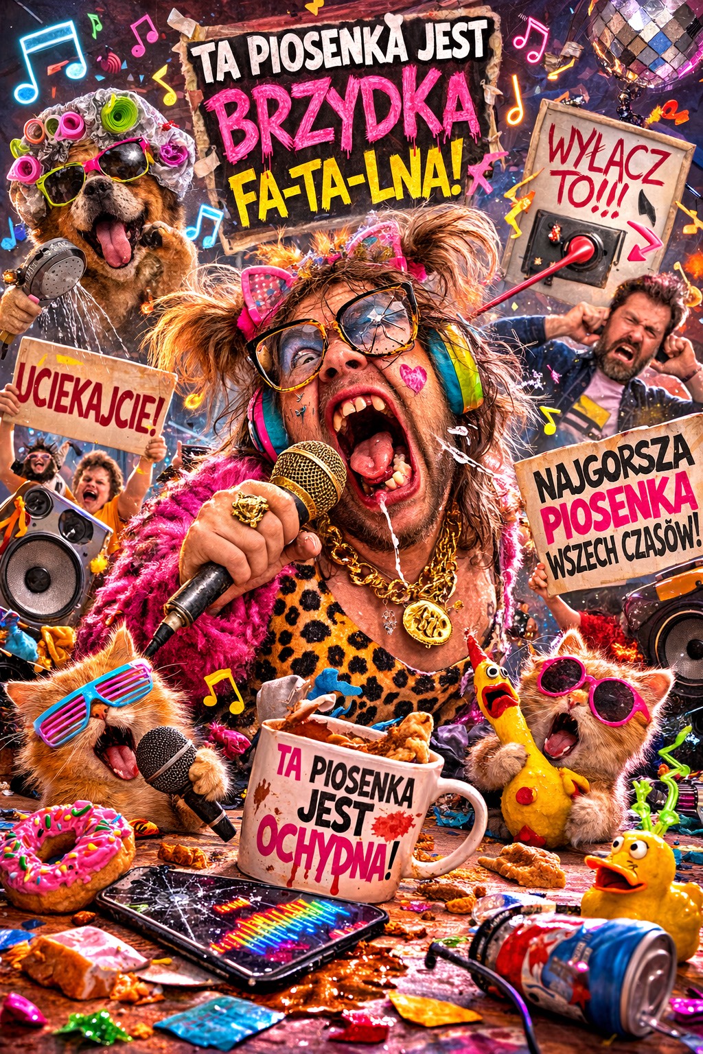 Create a catchy, humorous, satirical pop-punk song with absurd and sharp comparisons, Mood: playful, ironic, slightly dark comedy, Style: upbeat but punchy, energetic guitar/piano chords, simple drums, singable melody, Structure: multiple verses with vivid metaphors comparing women to songs (one beautiful, one terrible), repeated chorus: "brzydki widok jej kłuje me oczy / fałszywy dźwięk rani me uszy", Include one bridge with extreme absurd metaphors (e, g, woman like a 1998 modem, song like a Nokia ringtone), Tempo: 100–120 BPM, Make melody easy to remember and fun to sing, Keep phrasing natural, slightly sarcastic
