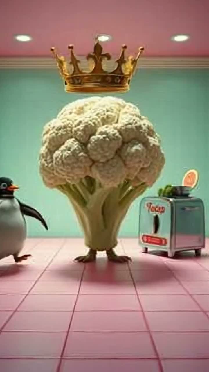 Chaotic comedy song with playful female vocal, Absurd humorous lyrics about cosmic cauliflower, dancing kitchen objects and surreal situations, Quirky upbeat electronic or funky pop beat, silly energy, exaggerated theatrical performance, Singer occasionally breaks the fourth wall with spoken humorous comments and reactions, Unpredictable rhythm changes, comedic timing, playful sound effects, funny chaotic vibe, slightly exaggerated comedic female vocal delivery