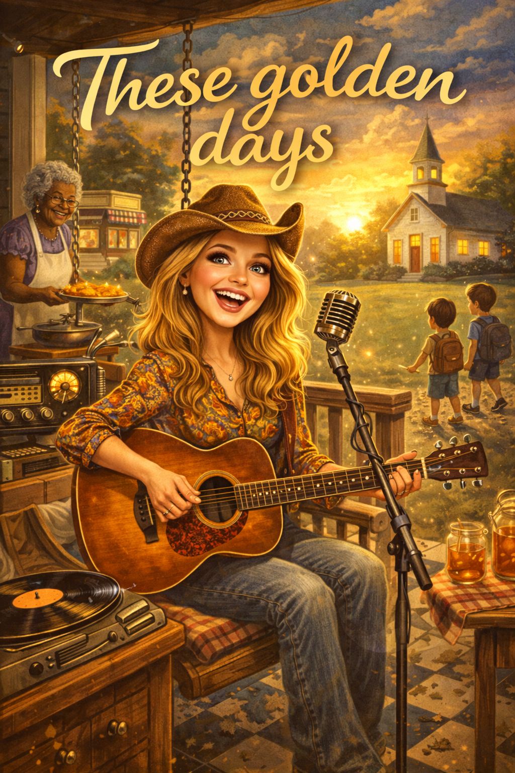 Energetic modern Country with a soulful, uplifting feel and a powerful gospel choir, driving rhythm, and warm organic instrumentation, Mid-to-fast tempo around 100–115 BPM, Key G major (or another bright, resonant key suited for vocal harmonies), Instrumentation: Steady country drum groove with punchy kick and snare, warm electric bass or upright bass, bright acoustic guitar strumming, twangy electric guitar fills and melodic licks, expressive fiddle lines, pedal steel swells for atmosphere, optional banjo or mandolin for rhythmic texture, piano or Hammond-style organ supporting the harmony, handclaps and stomp percussion to enhance the communal feel, subtle ambient reverb evoking open skies and church-hall acoustics, Vocals: expressive female lead vocals with heartfelt storytelling delivery, full gospel choir providing rich layered harmonies, call-and-response passages between lead and choir, uplifting, sing-along choruses, confident, passionate tone with occasional spoken ad-libs