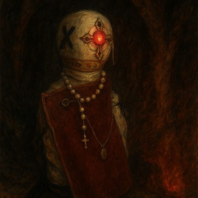 Steampunk waltz, horror, very deep male vocals, minor key, bells, chimes, pipe organ, slow, slow, unsettling, discordant, disturbing, haunting, sad, background noises, experimental, resonant, ethereal