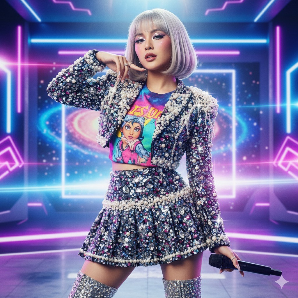 A high-octane K-pop dance song fuses electropop synths, thumping house kicks, and vocoder-tinged vocals, Verses mix enveloping bass and syncopated beats, while catchy choruses feature layered harmonies and bold, glittery leads, A bridge drops into trap-driven rap, then erupts into an electrifying final chorus