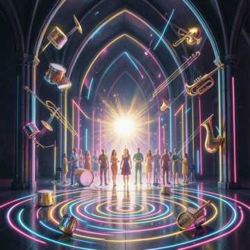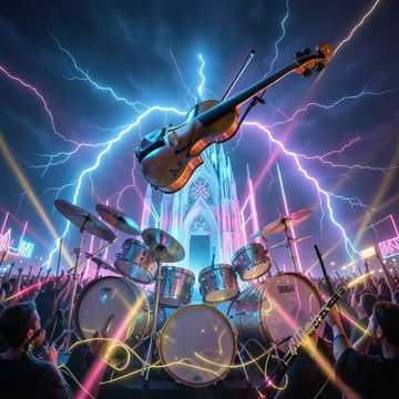 jazz, Gabber / frenchcore / hardstyle hybrid with female vocals; 200+ BPM slam, swung kick-row energy and bright trance leads, Verses start on filtered 50s doo-wop-style guitar and brushed snare illusion, then smash into full-stack distorted kick, 808 synths and buzzing bass, Chorus explodes like a rave gospel choir over soaring violin, Highland bagpipes, airy flute and didgeridoo drone, Techno stabs answer the vocal hooks; last chorus stacks gang vocals and octave doubles for a true festival anthem feel, violin, techno, gospel, hardstyle, uplifting, trance, swing