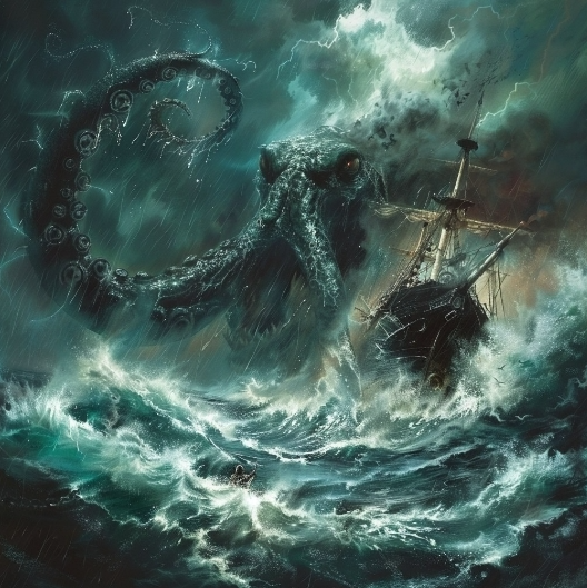 Pirate rock with elements of sky metal, Main structure: electroacoustic guitar and acoustic tambourine, creating a pirate mood with a light rock echo, Basic rhythm: drums with a heavy beat, including a fight with vibrato and somersaults, adding a sense of anxiety and adventure, Melodic lines: solo violin or mandolin to emphasize the marine theme and "ghostly"alternating in verses and stunning solos, Harmony and effects: electronic effects, echoes and roars to create the atmosphere of a mysterious ghost and battle, Smooth transitions and bridges: synthesizer with sea waves and background noise of waves to increase tension