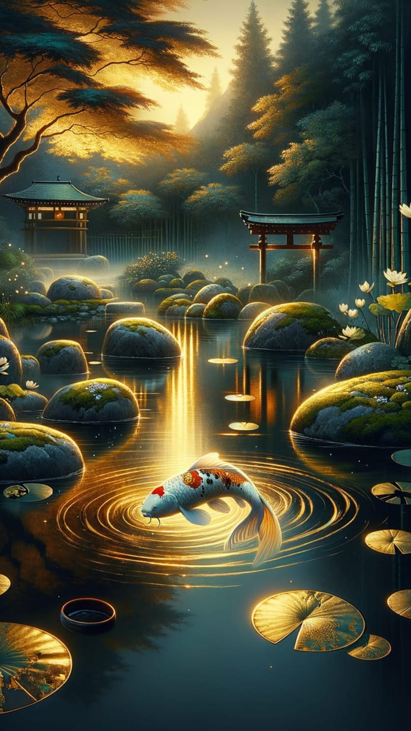 Indie folk with Japanese folk influence, Soft acoustic guitar, koto plucks, shakuhachi flute, gentle hand percussion, and warm ambient pond sounds, Calm, poetic, and reflective, Vocals gentle and emotional, Song about a kintsugi koi fish in a zen garden pond, Themes of healing, scars, and beauty in imperfection, Slightly mystical tone, serene and flowing