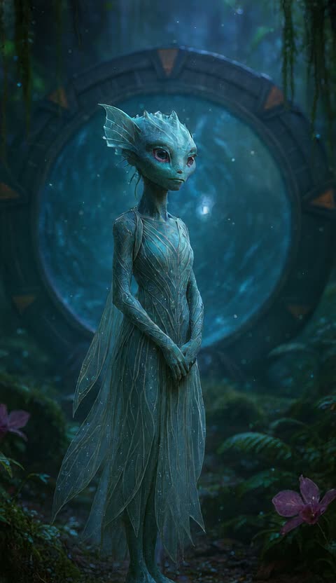 Experimental space opera trip hop, 80–90 BPM, female ethereal, whispered and spoken vocals with layered choirs, deep bass, hypnotic trip hop beats fused with orchestral percussion, reversed pads, dissonant strings, theremin, whale tones, underwater echoes, cosmic wind FX, bioluminescent synths, eerie alien textures, avant-garde, mysterious and ritual atmosphere, dramatic and theatrical progression