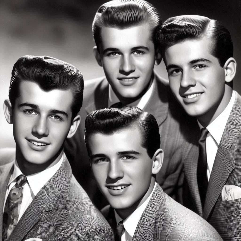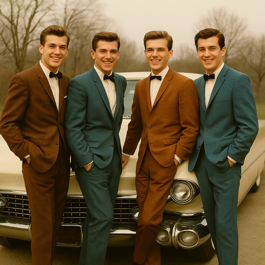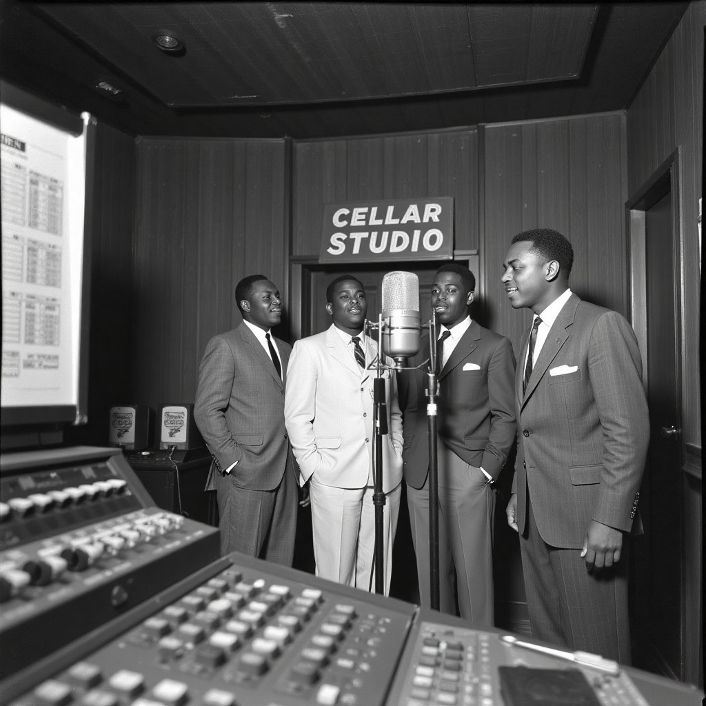 Authentic early 1950s Black doo-wop/R&B, Group vocals with tight three- and four-part harmonies, deep bass doo-wop lines, tenor lead, and energetic jive accents, Walking upright bass, brushed drum kit, muted electric guitar rhythm, occasional saxophone riffs, Tape-warm, slightly gritty analog mono sound, Influenced by The Cadets, The Ravens, The Swallows, and classic jive/R&B vocal groups, Warm mono tone, Recorded with vintage tube mic