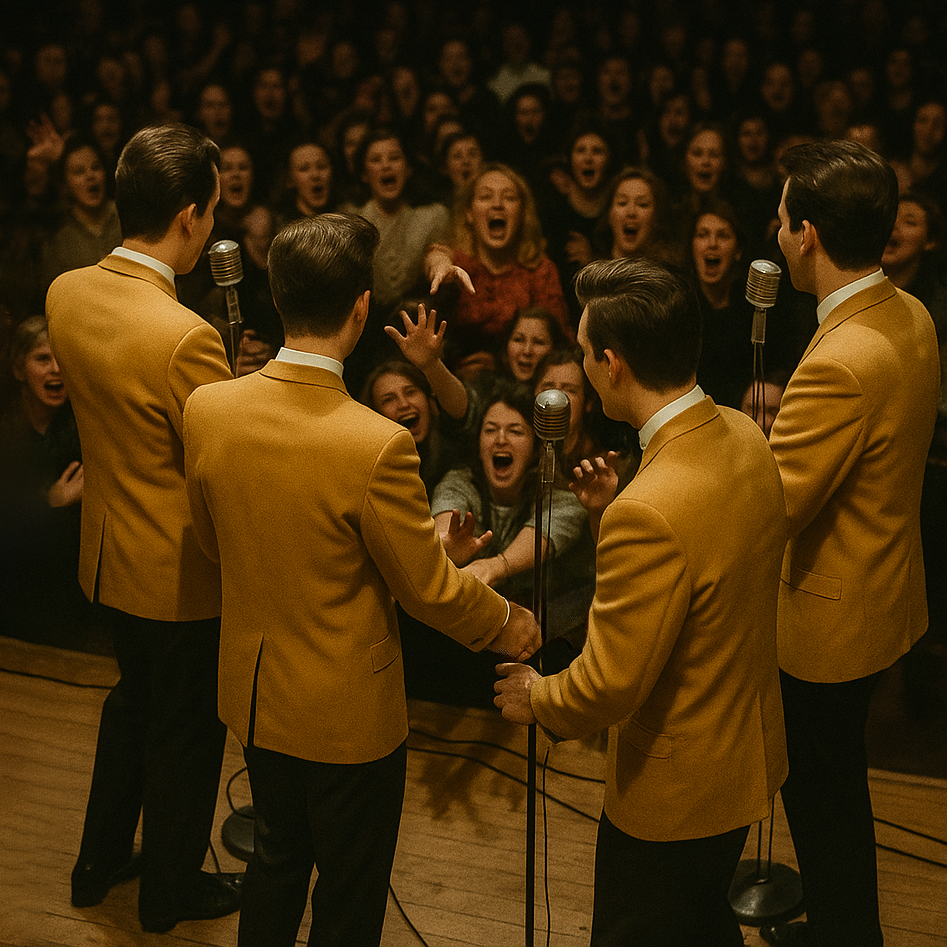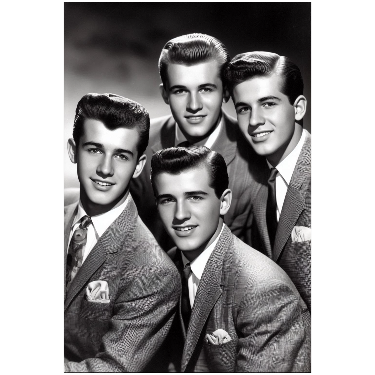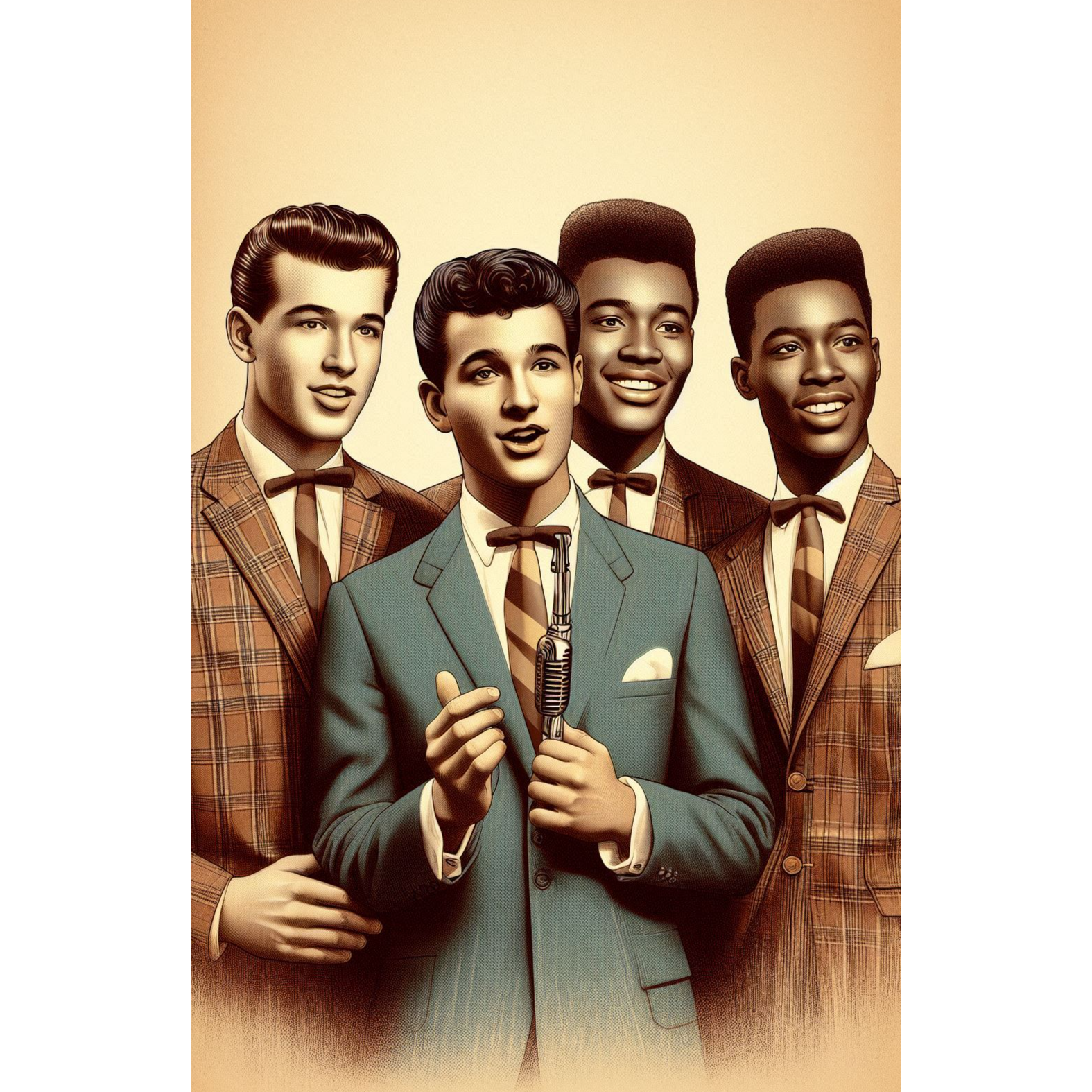Authentic early 1950s Black doo-wop/R&B, Group vocals with tight three- and four-part harmonies, deep bass doo-wop lines, tenor lead, and energetic jive accents, Walking upright bass, brushed drum kit, muted electric guitar rhythm, occasional saxophone riffs, Tape-warm, slightly gritty analog mono sound, Influenced by The Cadets, The Ravens, The Swallows, and classic jive/R&B vocal groups, Warm mono tone, Recorded with vintage tube mic