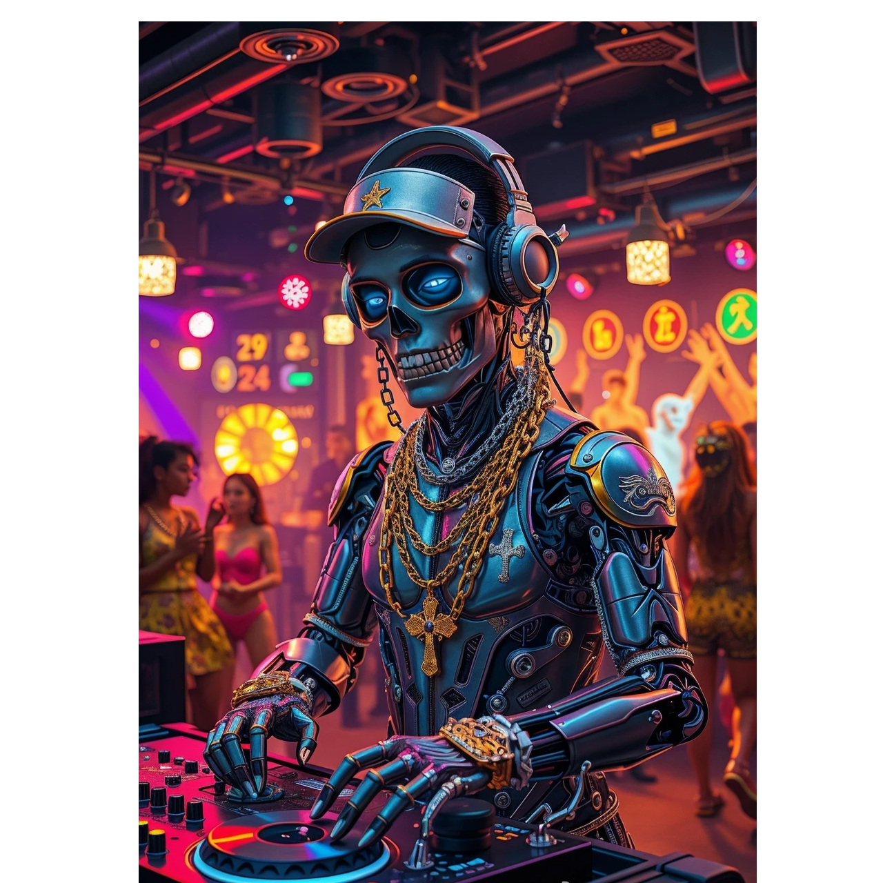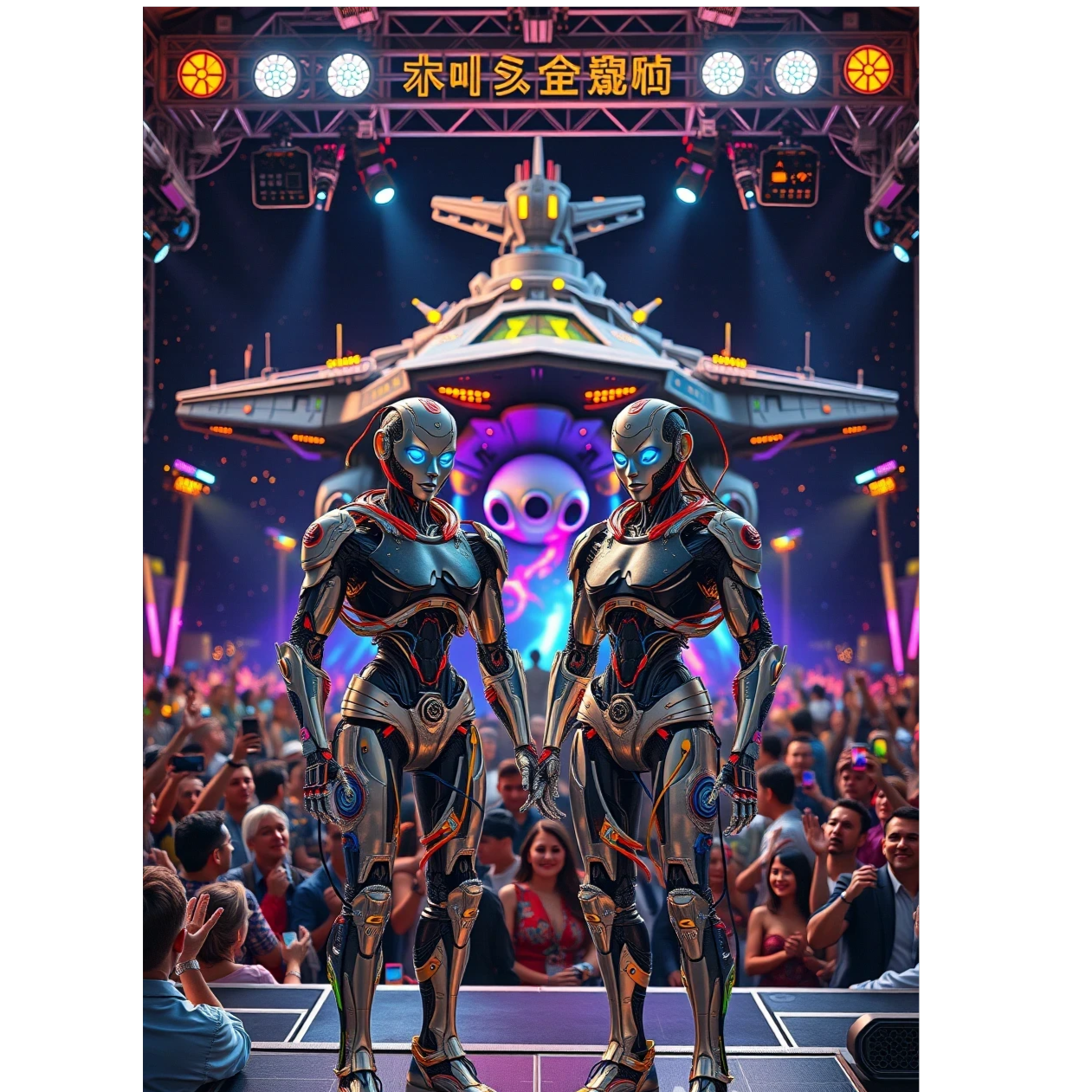 A 142 bpm techno/trance track erupts with pounding 4/4 kicks, deep, pulsating bass, precise hi-hats, and sharp snares, Synth-percussion layers and futuristic arps intensify builds and drops, Robotic, distorted female vocals and a dynamic duet soar in reverbed, compressed atmospheres, sustaining maximal club energy and dark, hypnotic tension