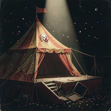 theatrical metalcore, emo metalcore, 84 BPM, intimate baritone lead, controlled fry screams, drop C guitars, octave guitar hooks, bass pedal tones, half-time drum groove, double-kick bursts, music box intro, carnival bells, ghostly backing vocals, stereo wall guitars, punchy modern mix, plate reverb snare, cinematic tension arc, emotionally devastating, anthemic chorus lift
