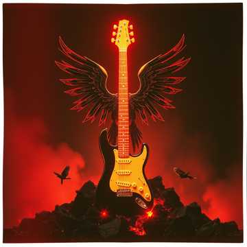 dive bombs, overdriven, soaring, tapped leads, pounding drums, fiery, thick distortion, rock, raw, raspy male vocals, intense and unrelenting energy, male vocals, soaring solo, hard rock
