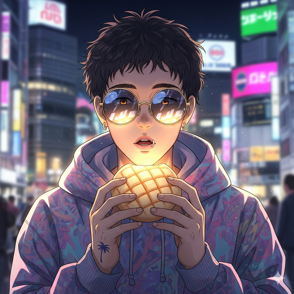 Create an Igor-core inspired song blending lo-fi hip hop beats, distorted synth bass, soulful chords, Lyrics mix Japanese and English, expressing the obsession of a foreign man who falls in love with melonpan in Japan, The mood should be dreamy, slightly bittersweet, but not toxic or dark, Tempo: ~92 BPM / 4/4 / Key: F minor