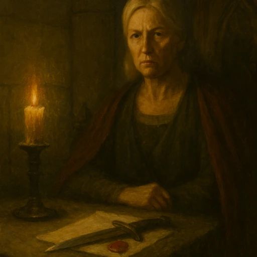 Midtempo power-thrash metal, Clean female vocals, expressive and articulate, carrying dignity, emotional weight, and quiet tension, Strong, steady drum pulse with presence, palm-muted rhythm guitars, and subtle string undertones, Heavy riffs combine with emotion and defiance, The chorus should be strong and anthemic