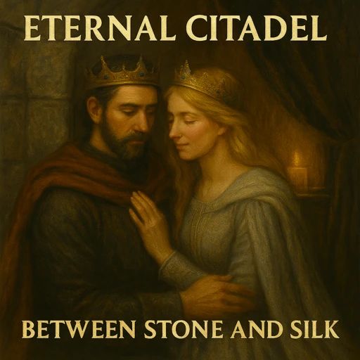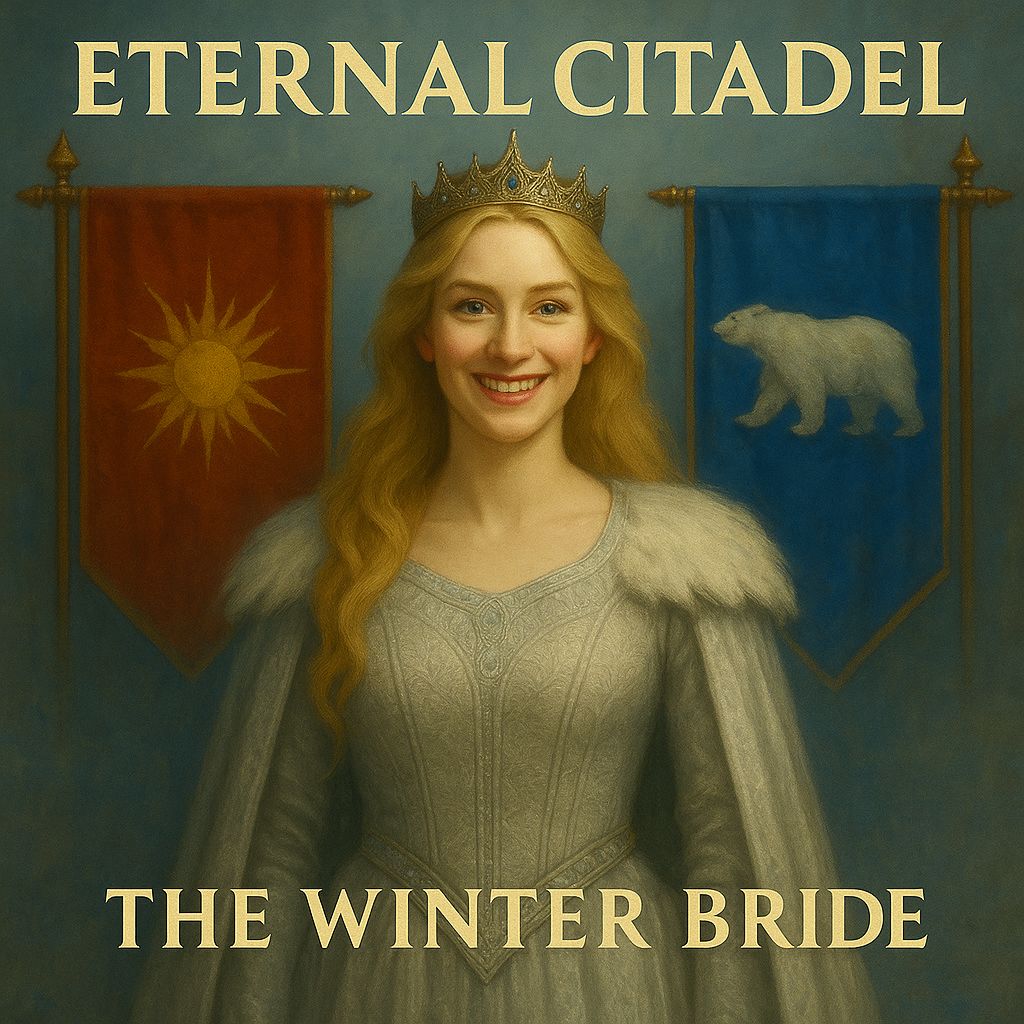 Mid-fast thrash metal around 180 BPM, Heavy, crunchy guitars with driving double-kick drums, Sharp, aggressive rhythm riffs mixed with a regal, winter-themed atmosphere, Subtle brass or low-string accents to give a royal ceremonial feel without overpowering the metal, Clean, powerful male vocals with dramatic intensity, Tone should feel icy, tense, and majestic, matching a political wedding between two kingdoms, Blend themes of frost and fire, hidden resentment, and looming conflict, Majestic thrash with a foreboding edge