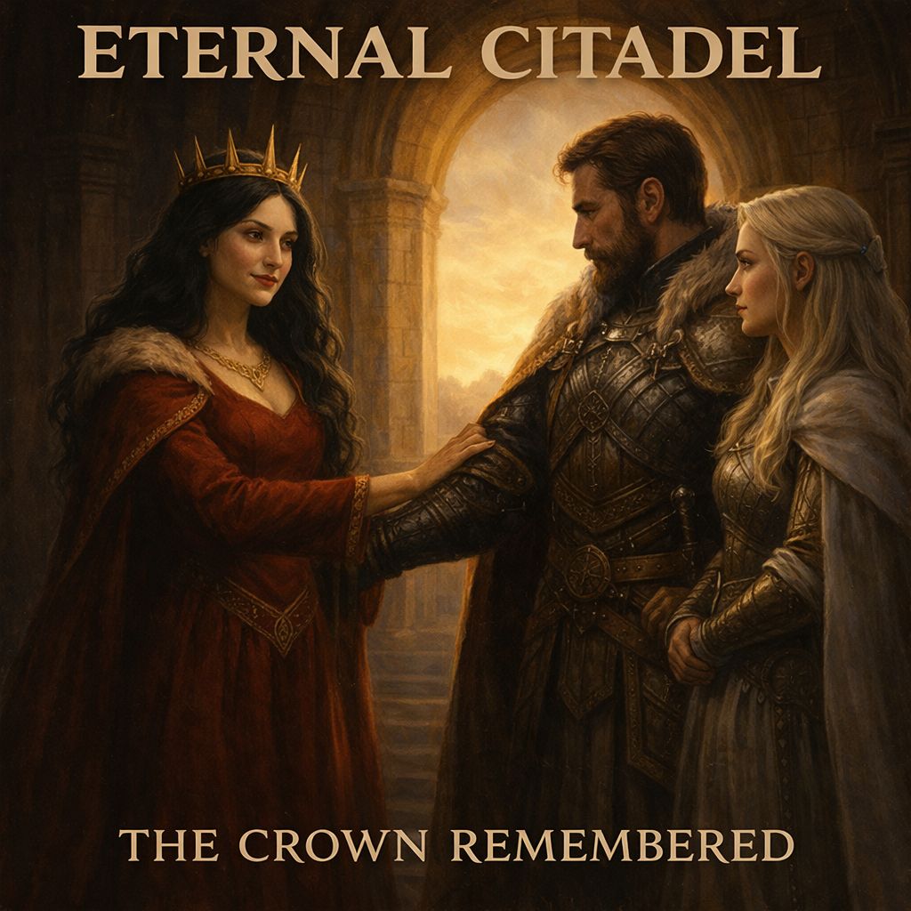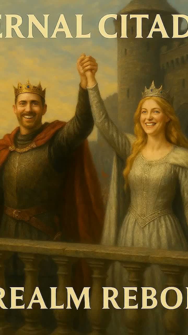 HEAVY power-thrash metal with fast, galloping rhythm guitars and twin-lead lines, Mid-fast tempo around 160–170 BPM, Driving bass that carries the melody forward, energetic drums with steady double-kick accents, and a heroic, battle-ready feel, Clean male vocals with strength and grit, delivering an anthemic, triumphant tone, Overall mood: bold, uplifting, and powerful, with a regal atmosphere that feels like a victorious moment in the relm, but still grounded and heavy