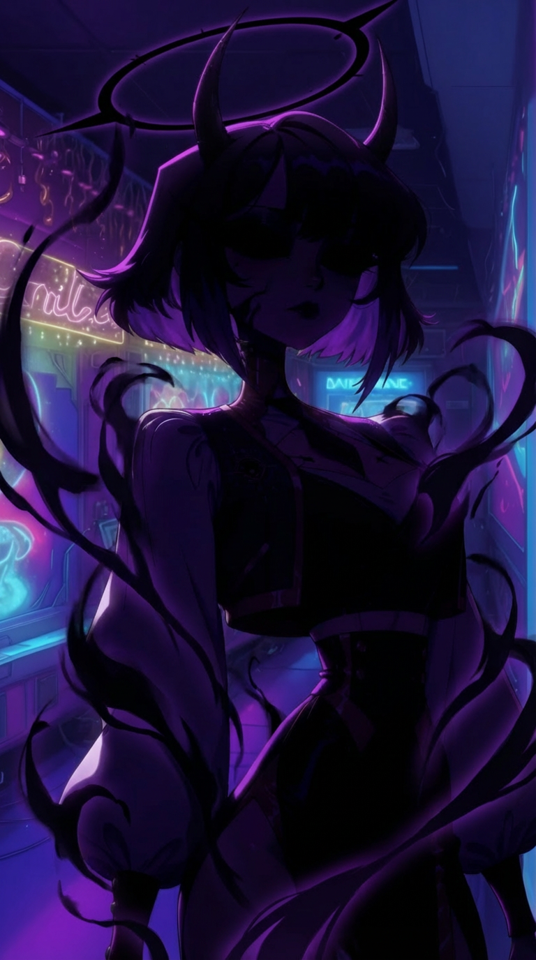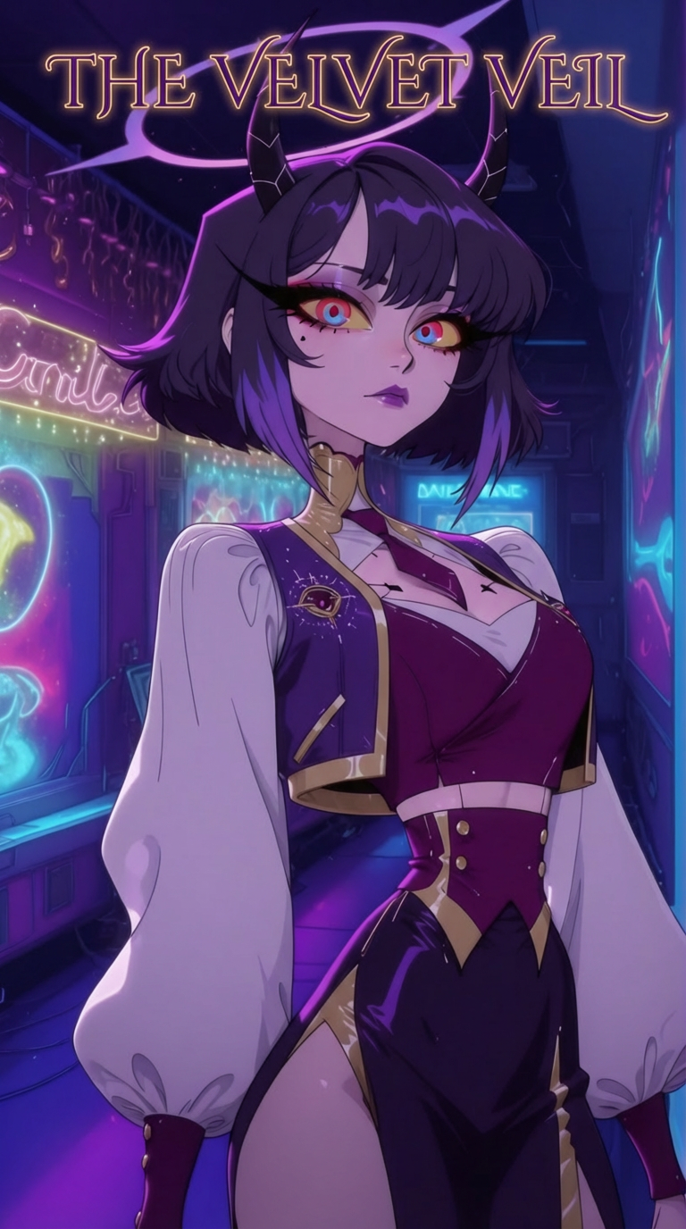 Neon Court Music: dark lounge, industrial jazz, cyber-trap fusion, Dark jazzy piano chords, detuned bell lead, 808 sub-bass, layered whispers, distant choir pads, 95 bpm, D Minor