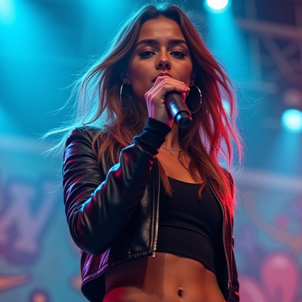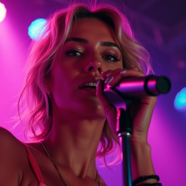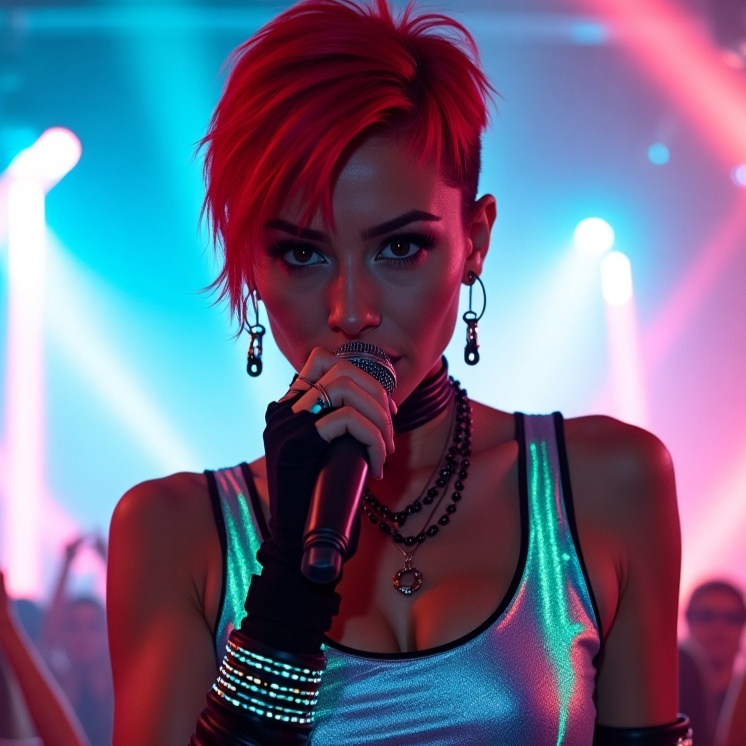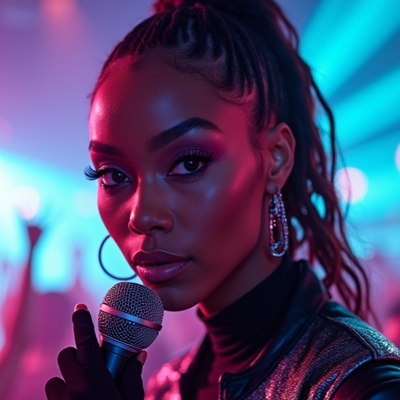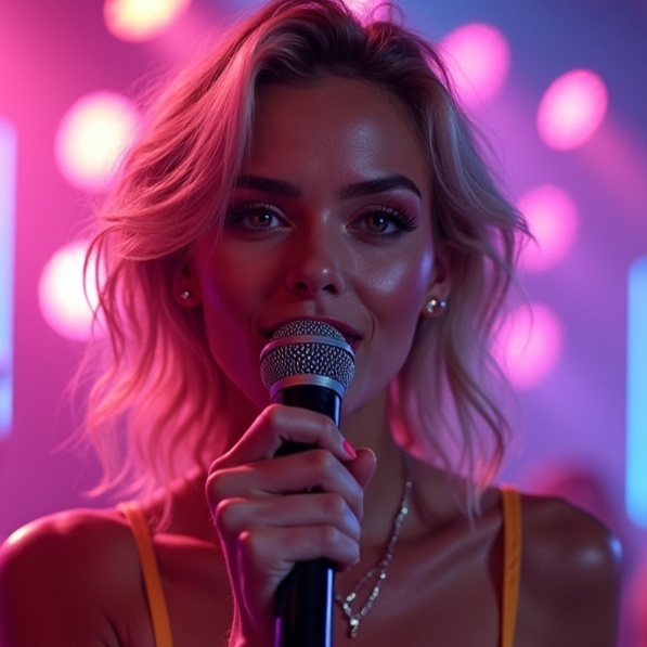 "Genre: Modern Disco Modern 2024 with elements of dance music, including house, techno and synthpop, Style: Catchy, groovy and dynamic melodies with unexpected musical twists and modern dance rhythms, Mood: Energetic, joyful and optimistic, The singer's voice: Powerful, sensual and expressive female vocals with a warm and attractive tone, capable of conveying the emotions and energy of dance music, Tools: