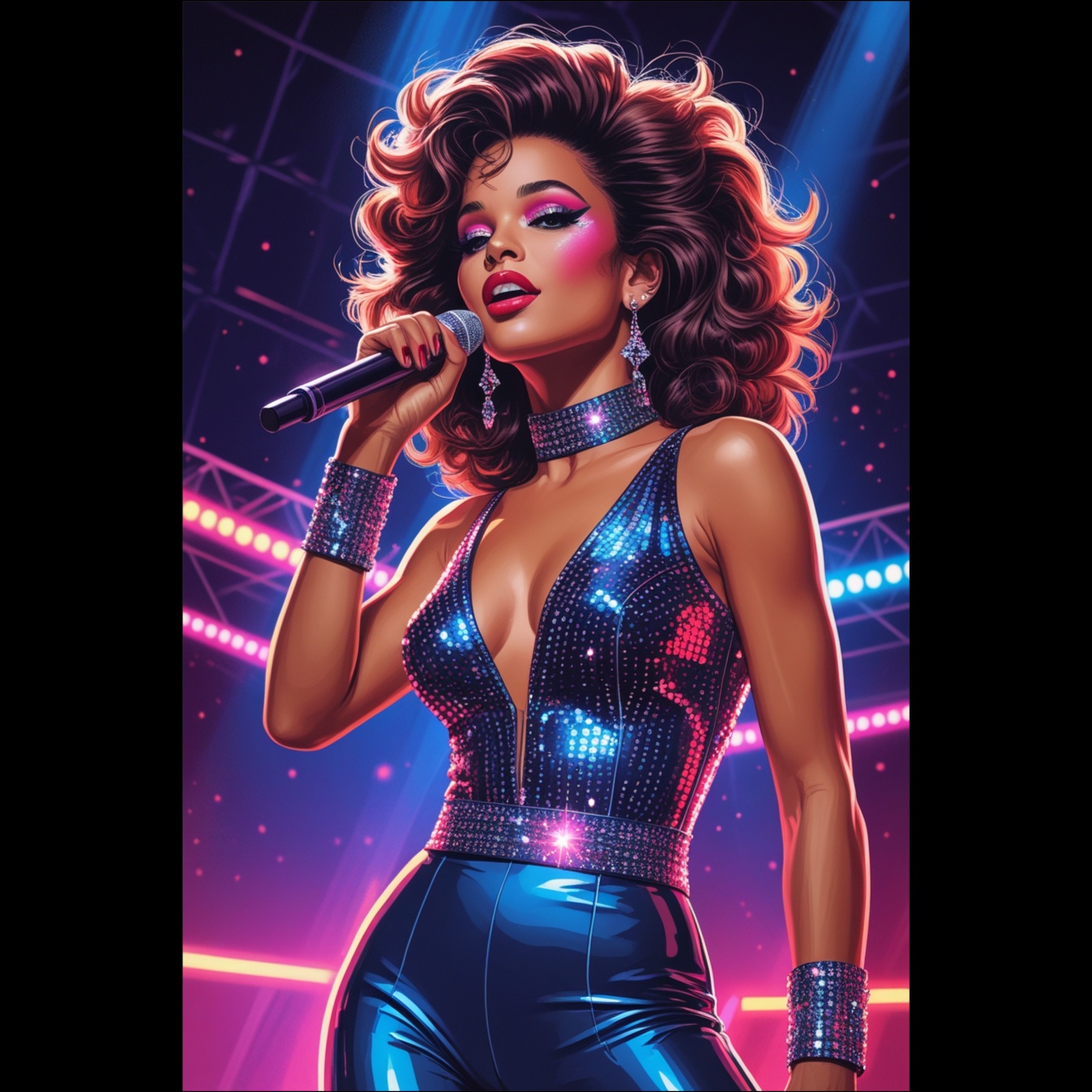 Mid-80s Italo-disco; Minimoog strong synths, electronic rhythm with clear beat; Roland TR-808 drum machine, 120 BPM; female melodic vocals, make the vocals louder and more prominent