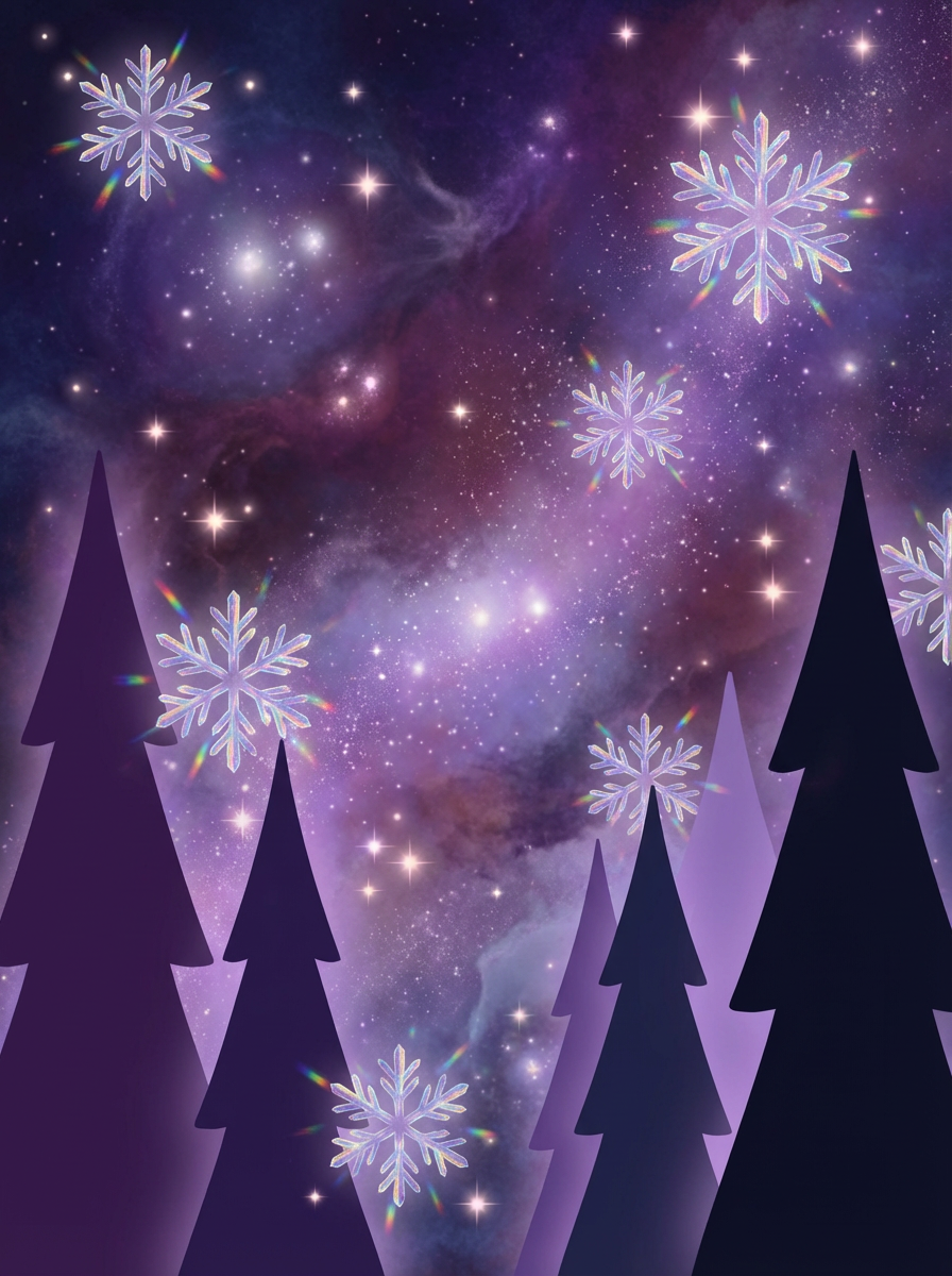 Ethereal ambient holiday dreamscape: slow, swelling pads and celestial synths, choral female vocals in soft clusters, twinkling bell tones like distant stars, and airy whooshes suggesting winter wind, Verses stay hushed and close, almost whispered over spacious reverb; chorus blooms wide with layered harmonies, gentle low choir undercurrent, and prism-bright chime arpeggios, The mix is immersive and cinematic, drifting, with long tails and subtle volume swells to feel like floating through a cosmic winter forest, uplifting, slow, ambient, gentle, soft, deep, magical, choral