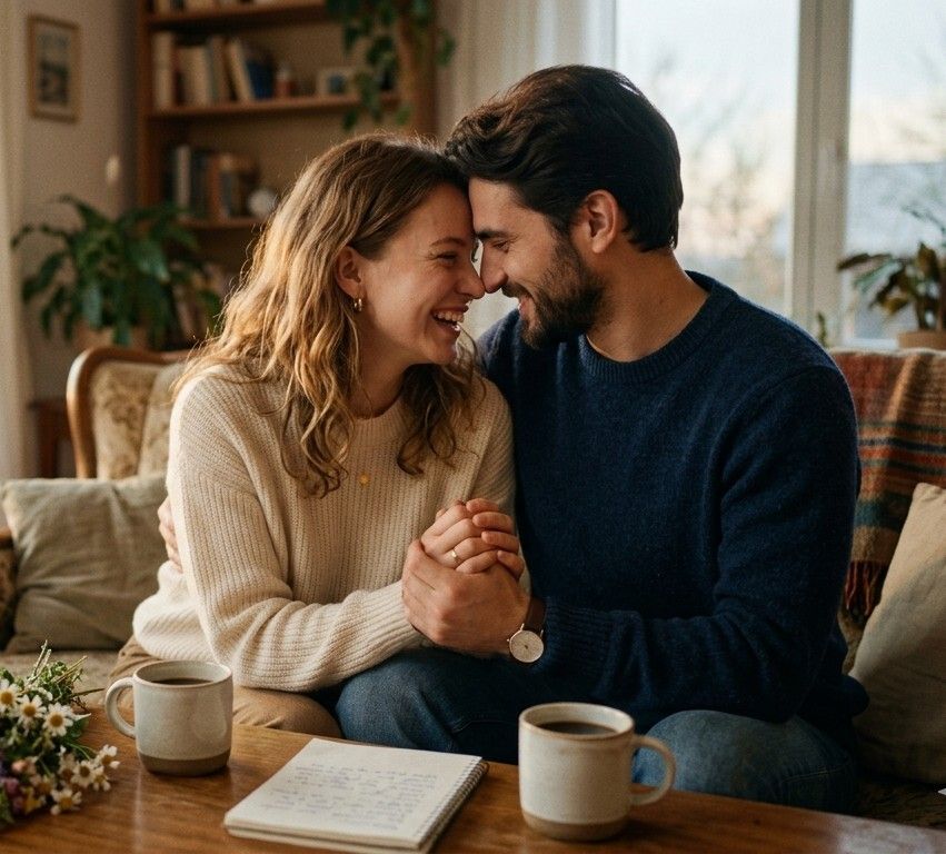 Emotional romantic duet, male and female vocals, warm deep male vocals and silky smooth female vocals, beautiful emotional delivery, crystal clear enunciation, intimate verses with male lead, powerful yet tender female harmonies in chorus, male-female harmonizing, professional clean studio production, glossy polished mix, warm mids, crisp airy highs, tight warm low end, light plate reverb only on vocals, dry intimate lead with subtle depth, wide cinematic stereo image, high-fidelity mastering, radio-ready sound, soft acoustic guitar, gentle piano chords, dreamy pads, delicate strings, 85-92 BPM, very pleasant to listen, heartfelt and beautiful atmosphere