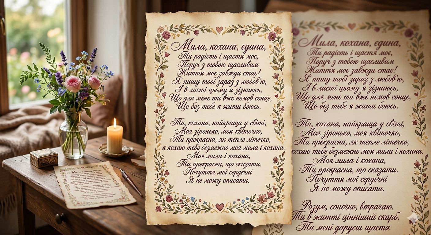 Create a beautiful, emotional romantic ballad in Ukrainian language with gentle male lead vocals and soft female background vocals, Slow tempo, intimate atmosphere, warm acoustic guitar, soft piano, subtle strings and light pads, High Fidelity, Studio Recording, Mastered, Crisp Vocals, Balanced Mix, crisp male vocals, clear enunciation, dry lead vocal, subtle hall on backgrounds, front-and-center vocals, prominent lead vocal, less wet mix, professional studio mix, crisp highs, tight low end, wide stereo image, Soft, dreamy and deeply romantic mood, like a tender love confession at night, Male vocals gentle and warm, female vocals gentle and ethereal, Structure: Verse 1 - Pre-Chorus - Chorus - Verse 2 - Pre-Chorus 2 - Chorus - Bridge (with whispers and low register) - Final Chorus with variation - Outro fading softly, "