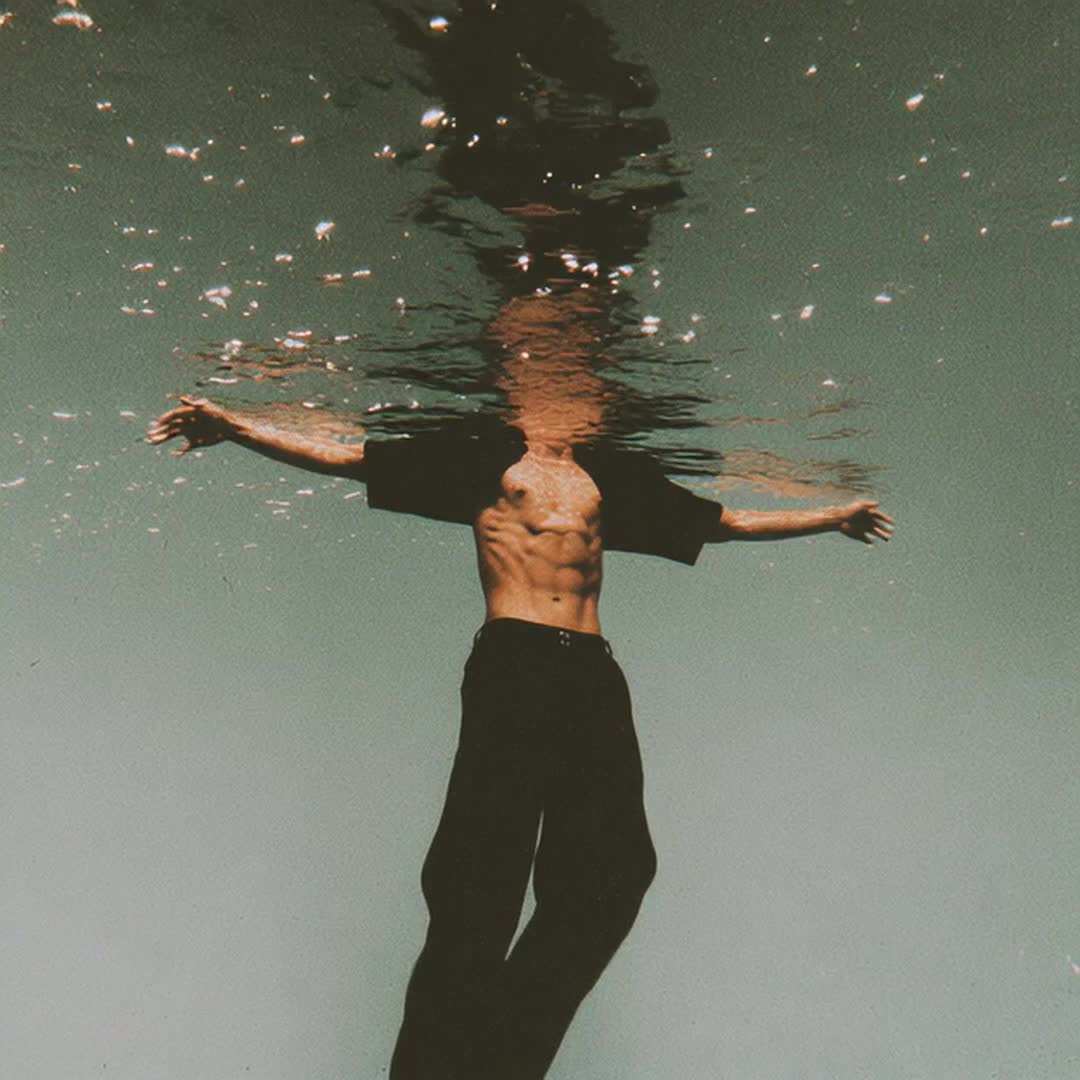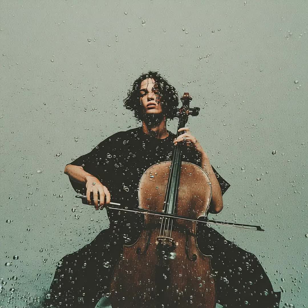 fragile moody male vocal, intimate and raw—half‑spoken, half‑sung, breathy like Keaton Henson's with Olivia Rodrigo’s emotional heft, Minimalist acoustic ballad with ambient orchestral, bowed cello undercurrents, Theme: drowning in grief, panic vs, surrender, the pull of darkness, Arrangement: