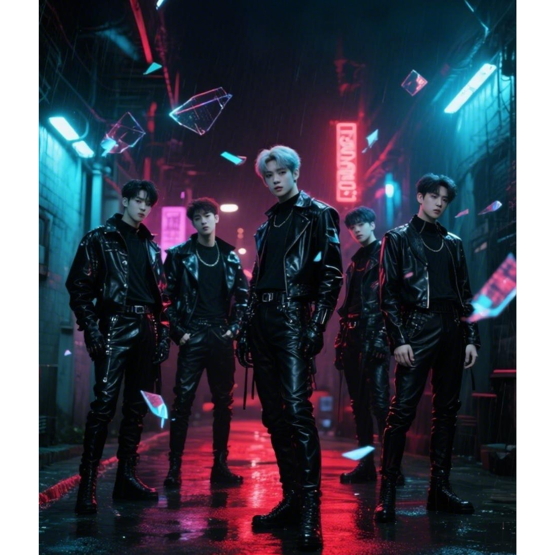 A dark, sensual K-pop track for a boy group, Fuses heavy synth-bass, glitchy hyperpop elements, and a driving electronic beat, Features prominent DJ scratches and a hypnotic, provocative vibe