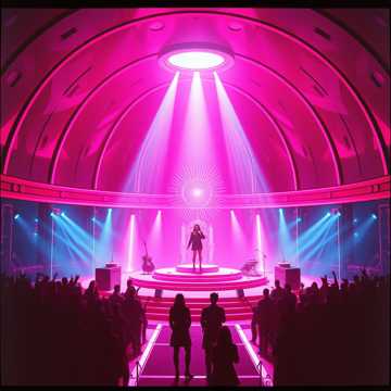 live dome concert ambience, large indoor stadium reverb, long decay reverb tail, distant PA mix, far-field perspective, room mic heavy + PA blend, crowd noise bed (cheers, chatter), wide stereo room reflections, slight slapback delay, occasional PA feedback squeal