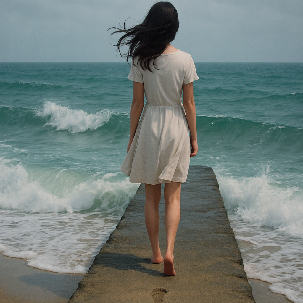 The track begins with a soft, echoing water droplet sound layered over distant low drones and a single slow temple bell strike, creating a sense of foreboding, The first verse blends airy female vocals with deep cello drones and subtle reversed harp plucks, evoking both tenderness and unease, Percussion enters gradually with muted taiko hits and sub-bass pulses, building tension, The chorus opens with sweeping orchestral strings, layered choirs, and resonant brass swells, conveying both beauty and doom, The second verse mirrors the first but with increased urgency, adding rhythmic low toms and tremolo strings, The bridge features an experimental section with reversed water samples, polyphonic chanting, and deep bass booms, creating a surreal, timeless atmosphere, The outro reduces instrumentation to a lone flute and sustained low strings fading into silence, leaving an unresolved tension, Vocals are treated with warm reverb and occasional stereo delay to enhance the mythic quality, ‑electric guitar power chords, ‑pop punk drum beats, ‑country fiddle, ‑reggae bassline, ‑ska brass stabs, ‑modern trap percussion, ‑EDM supersaw synth leads, ‑upbeat funk rhythm guitar, ‑gospel handclaps, ‑lo-fi static, ‑blues shuffle groove