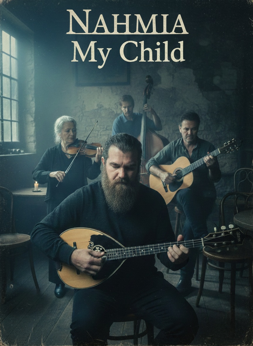 Very old Greek rebetiko / mángas style, but gentle and heartfelt, like a father singing softly to his daughter, Intimate, protective, lullaby-like mood, Lead bouzouki plays slow, warm, emotional melodies with light ornamentation, Accordion supports with soft, steady chords, breathing like a calm heartbeat, Occasional delicate violin phrases for emotional lift, Very simple, slow drum beat in the background (soft frame drum or brushed snare), barely present, No alcohol, no sleaze, no rowdy crowd energy, Vintage mono recording character, warm, quiet, close-mic’d voice, Feels like a late-night bedside song in a small Greek home, loving, reassuring, nostalgic