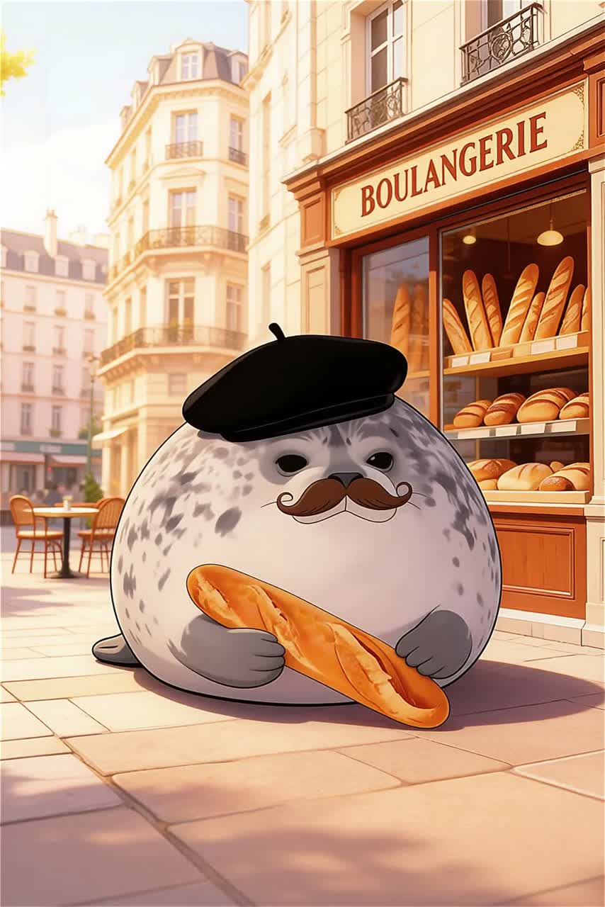 Cute cinematic orchestral hybrid with whimsical French vibe, Sawano-style scoring blended with playful K-pop and light future bass, quirky and humorous tone, featuring accordion lead, musette-style melodies, toy piano, celesta, music box, pizzicato strings and light harp, crystal-like plucks and bubbly synths, soft bouncy 808 with gentle glitchy slices, claps and snaps percussion, subtle waltz or café rhythm feel, bright and cheeky atmosphere with a touch of absurd charm, like a stylish seal carrying a baguette in a dramatic yet silly scene, dynamic build from delicate twinkling intro to energetic playful climax, wide stereo imaging, soft reverb space, studio-quality, stereo, highly detailed mix, cinematic mastering