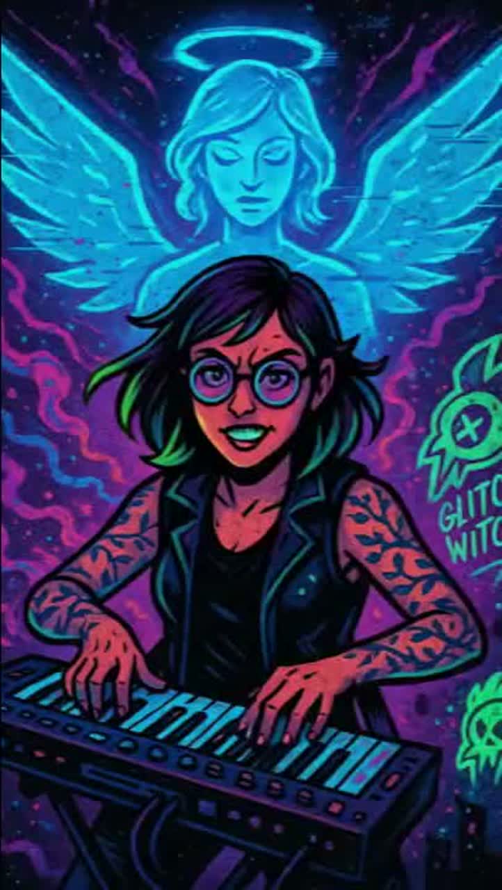 High-energy fusion of dark chillwave, witch house, soft math rock, nu jazz, turntablism, & 8-bit, Female vocals, glitch aesthetics, complex unstable rhythms, High fidelity, futuristic and religious