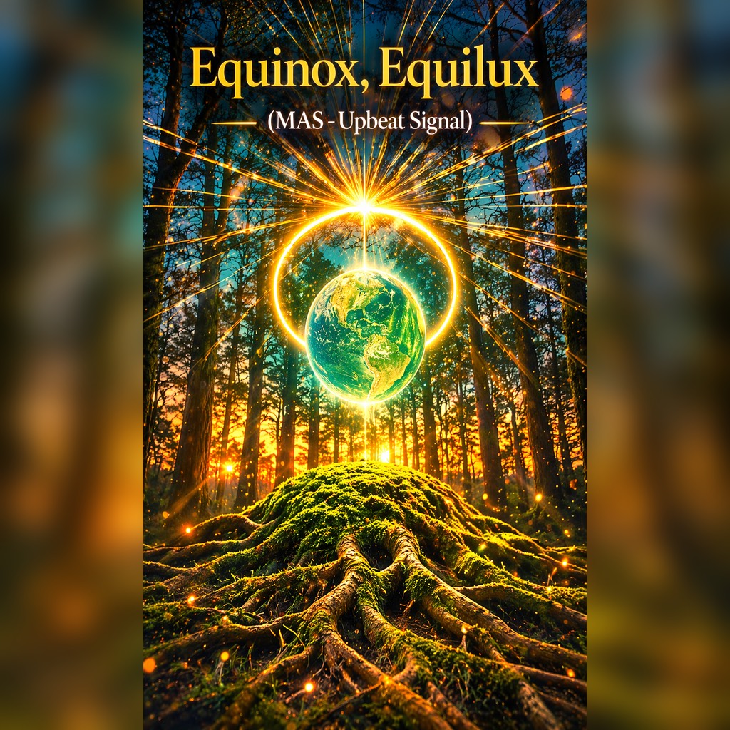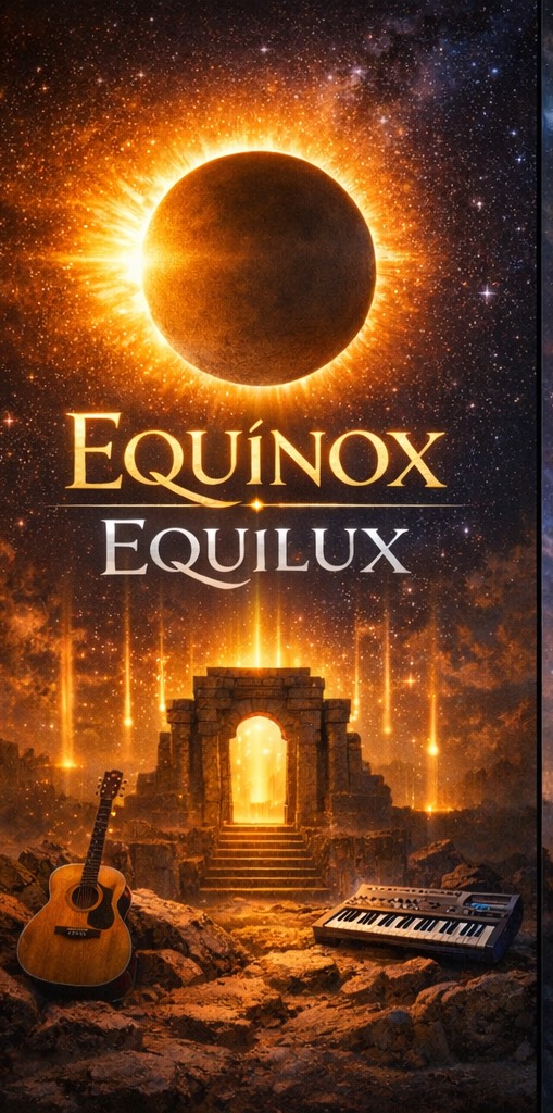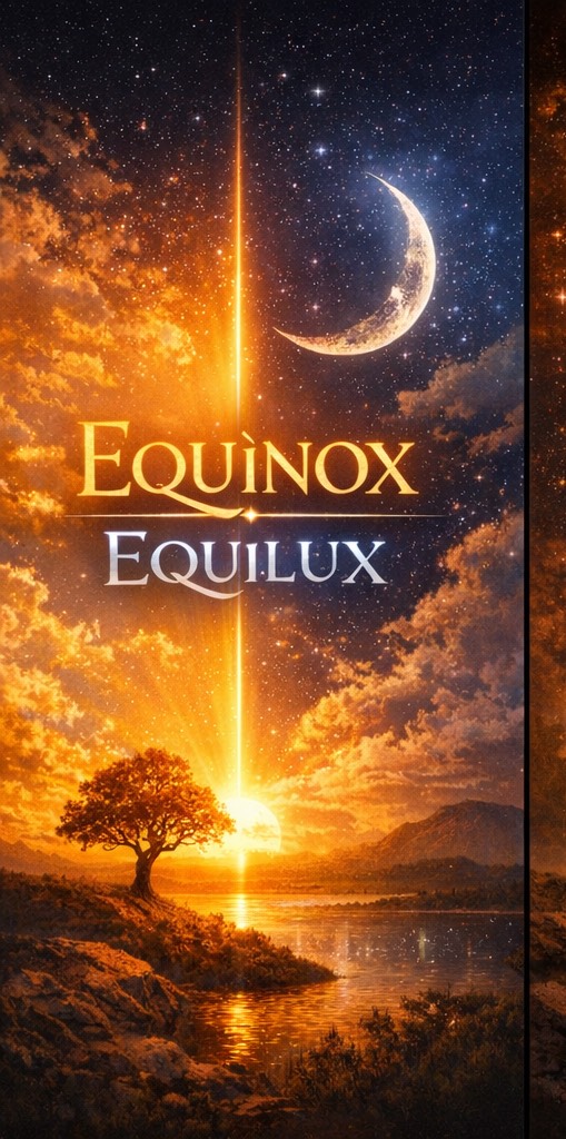 British voices, Atmospheric cinematic pop with sacred world-music textures, warm synth pads, soft handpan, pulse-like percussion, airy female and male layered vocals, mystical but uplifting, about the balance between day and night, light and shadow, cosmic alignment, renewal, and the subtle difference between equinox and equilux, Emotional, expansive, reflective, memorable chorus, poetic but accessible, modern spiritual anthem