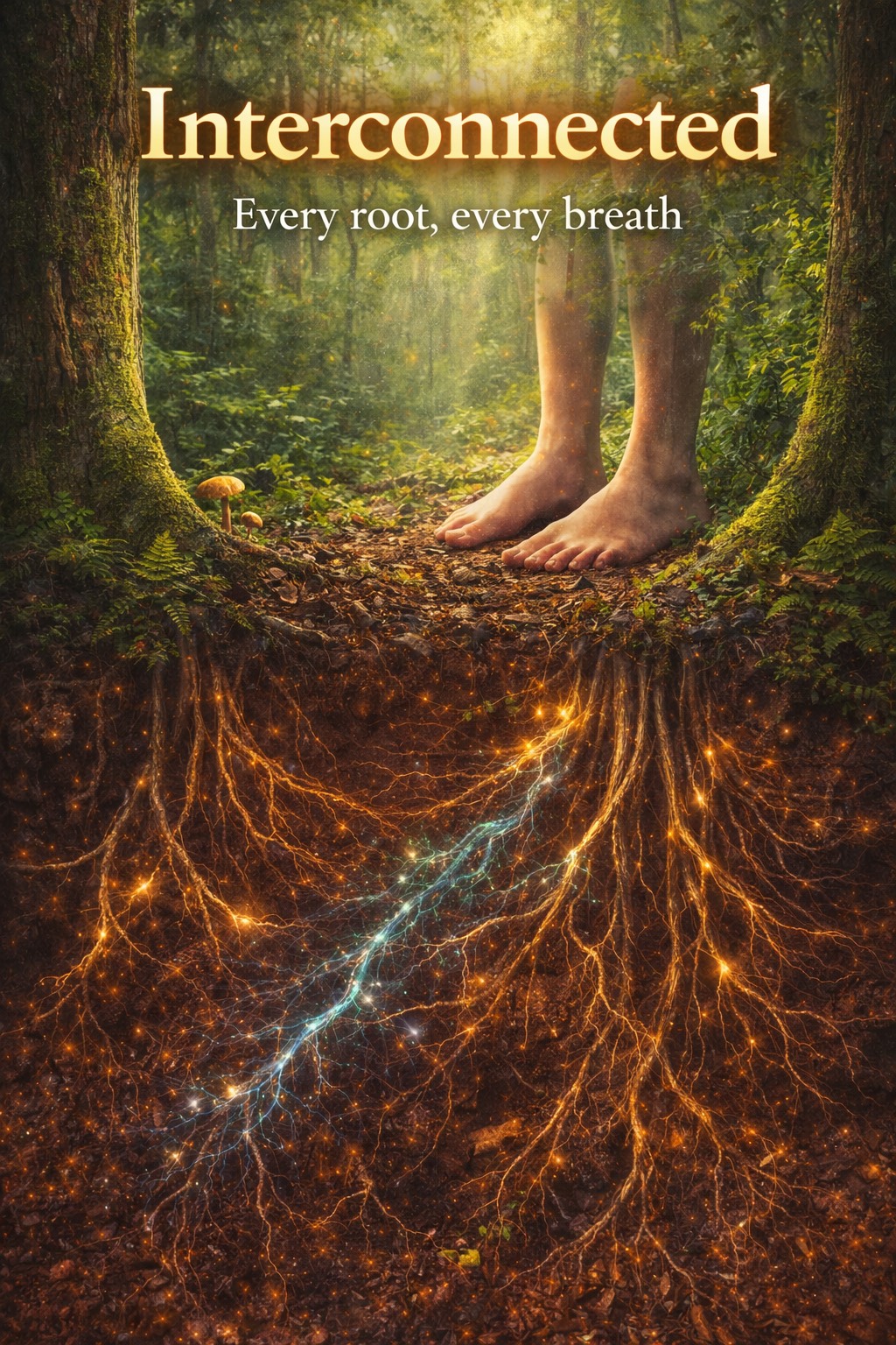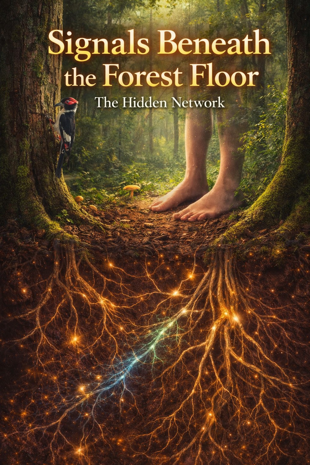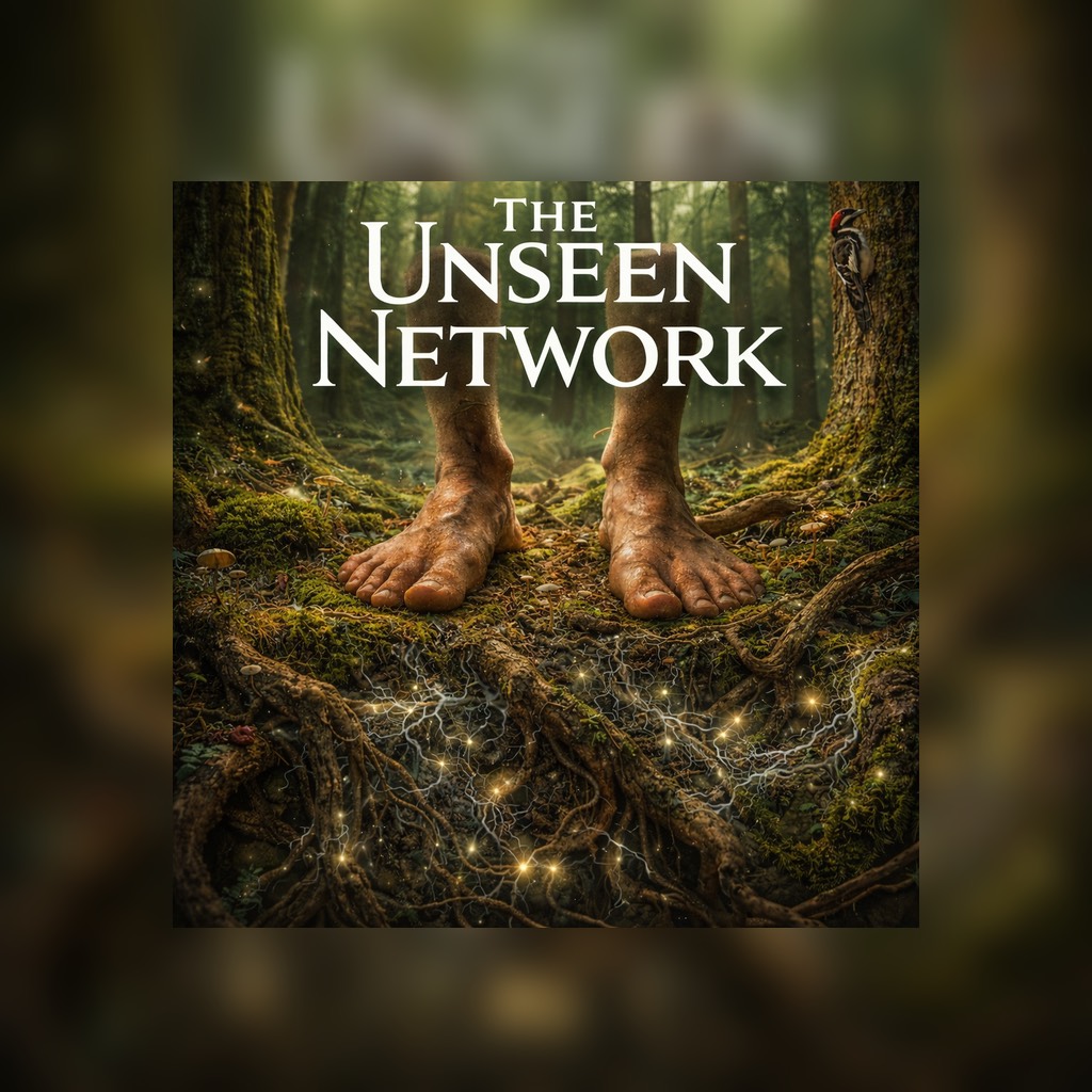 Slow cinematic indie folk song with a calm nature documentary atmosphere, Very relaxed tempo around 72–78 BPM, gentle and meditative, The song begins quietly with barefoot footsteps in a misty forest, fingerpicked acoustic guitar and soft forest ambience, Wooden percussion mimics a slow woodpecker tapping rhythm, The music gradually expands as the singer discovers the hidden mycelium network connecting the forest, The chorus opens gently with warm piano and subtle orchestral strings representing Earth’s interconnected systems, The final chorus feels wide and peaceful, like seeing the whole planet as one living network, Intimate British male vocal, warm reflective delivery