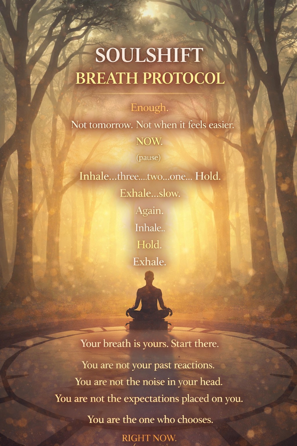 Cinematic ambient breathwork meditation, deep calm male voice, slow tempo ~50 BPM, minimal piano, atmospheric pads, low heartbeat pulse, subtle choir textures, sacred world music influence (handpan, soft bells), grounded and authoritative tone, spoken word not singing, long pauses for breath cues, immersive, introspective, emotionally powerful but controlled, no hype, no aggression, focus on breath pacing and presence