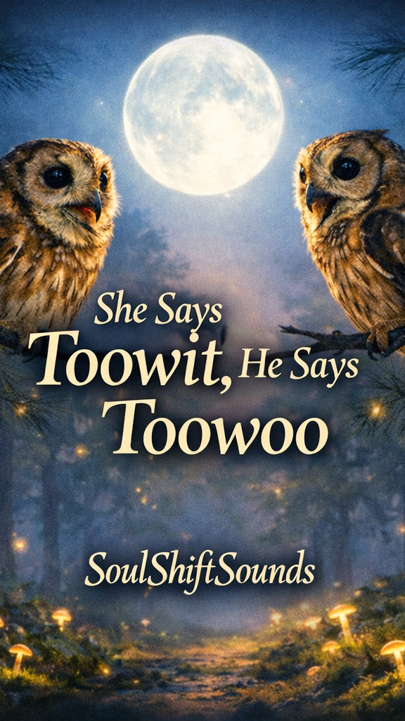 British voices, Mystical woodland folk-ambient, tawny owl duet, soft handpan and bansuri, moonlight to dawn, British male/female echo vocals, tender playful romance, bonding with boundaries, refrain “she says toowit, he says toowoo, ” ending with “witwoo!” 72 BPM