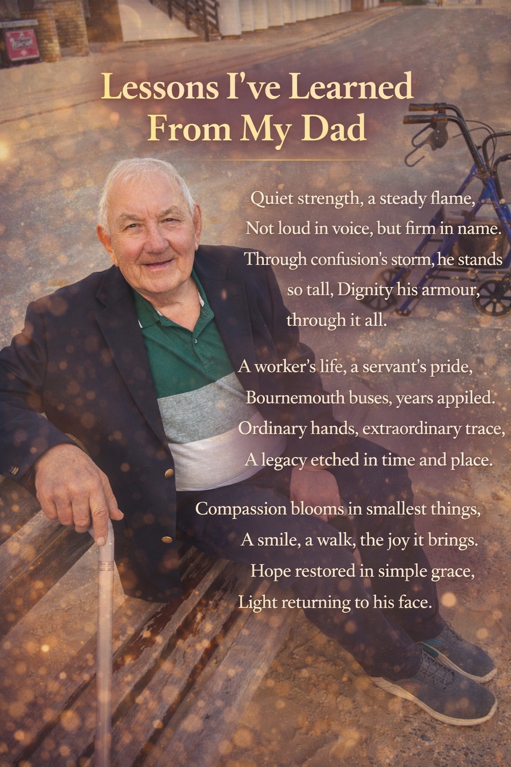 Timeless poetic ballad, warm and intimate, reflective male vocal, tender and wise, deeply human, cinematic folk with soft orchestral lift, acoustic guitar, felt piano, gentle strings, light brushed drums, spacious ambient reverb, elegant and emotionally rich, like a cross between folk troubadour, modern hymn, and cinematic legacy song, Slow to mid-slow tempo, Nostalgic, soulful, reverent, uplifting without becoming sentimental, The mood should feel like looking back over a whole life with gratitude, love, and hard-won wisdom, Sing with clarity, warmth, and quiet authority, Emphasize lyrical storytelling, emotional restraint, and a beautiful soaring chorus, No melisma, no oversinging, no pop clichés, no heavy production