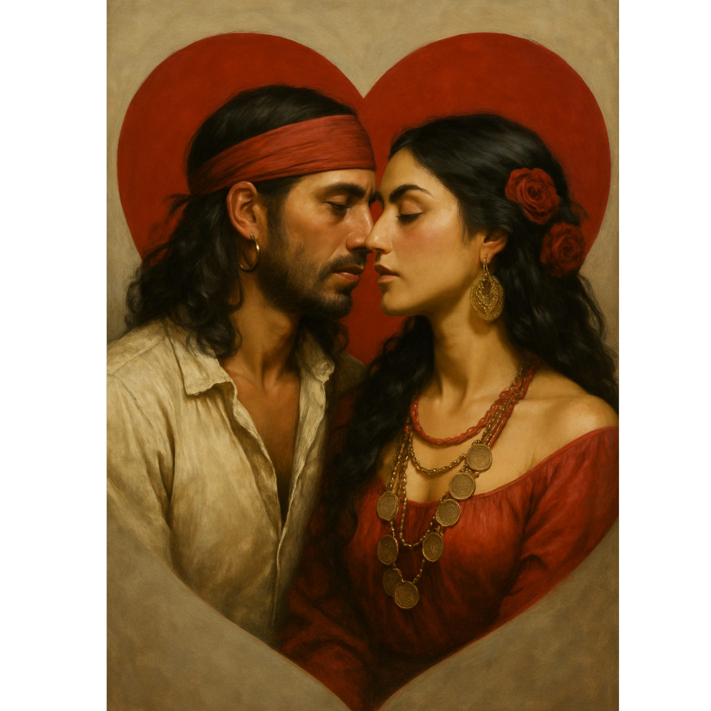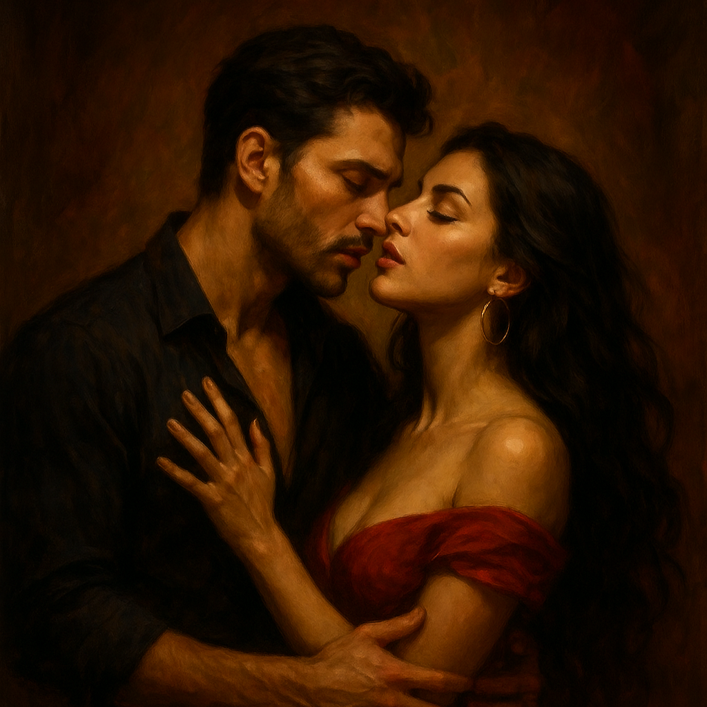 > Dueto sensual entre voz masculina cálida y voz femenina soul latina, Estilo musical: fusión de pop latino moderno y flamenco, Guitarra flamenca emocional con acordes melódicos, ritmo latino moderno (tipo bachata suave con toques de reggaetón elegante), percusión con cajón y palmas, bajo suave y envolvente, Arreglos sutiles con cuerdas y pads ambientales, ]