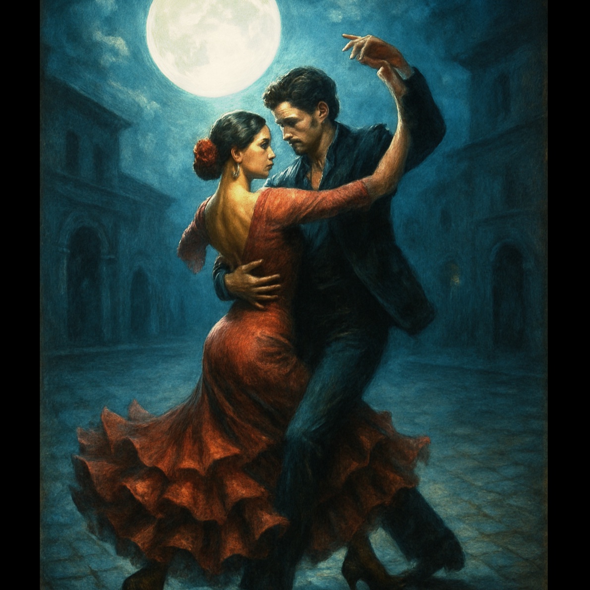 [Passionate flamenco-tango love song with an emotional, orchestral introduction, Duet of flamenco guitar and accordion throughout the track, blending sensual Latin rhythms and dramatic harmonies, Starts with a slow orchestral build-up, then moves into a rhythmic tango groove with expressive guitar strumming and lyrical accordion melodies, Intimate, romantic, and cinematic mood, Tempo: 90 BPM, Key: A minor, Includes soft string background during the intro and bridge, Inspired by Astor Piazzolla and flamenco tradition, with dramatic pauses and heartfelt dynamics, ]