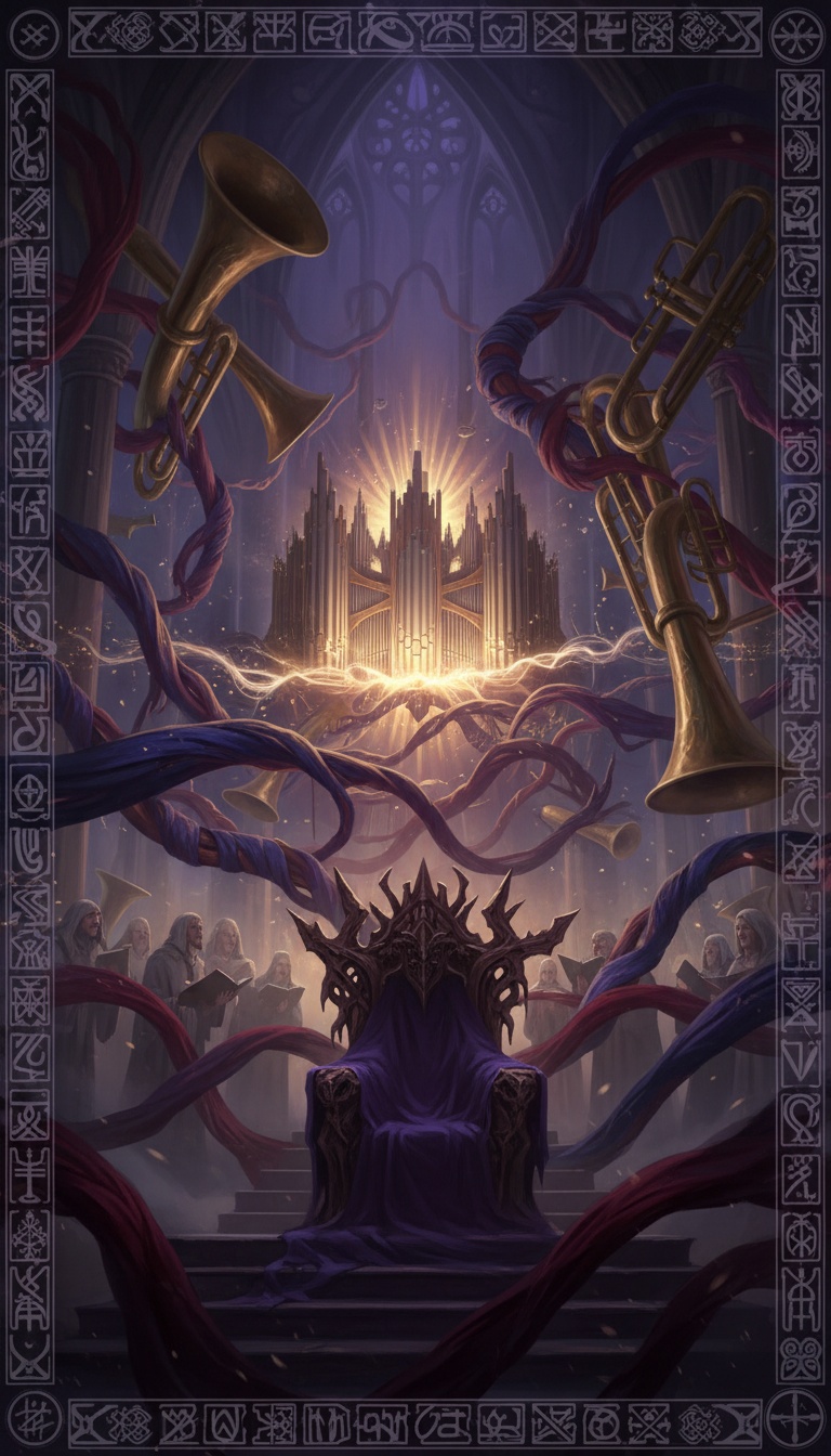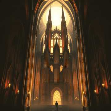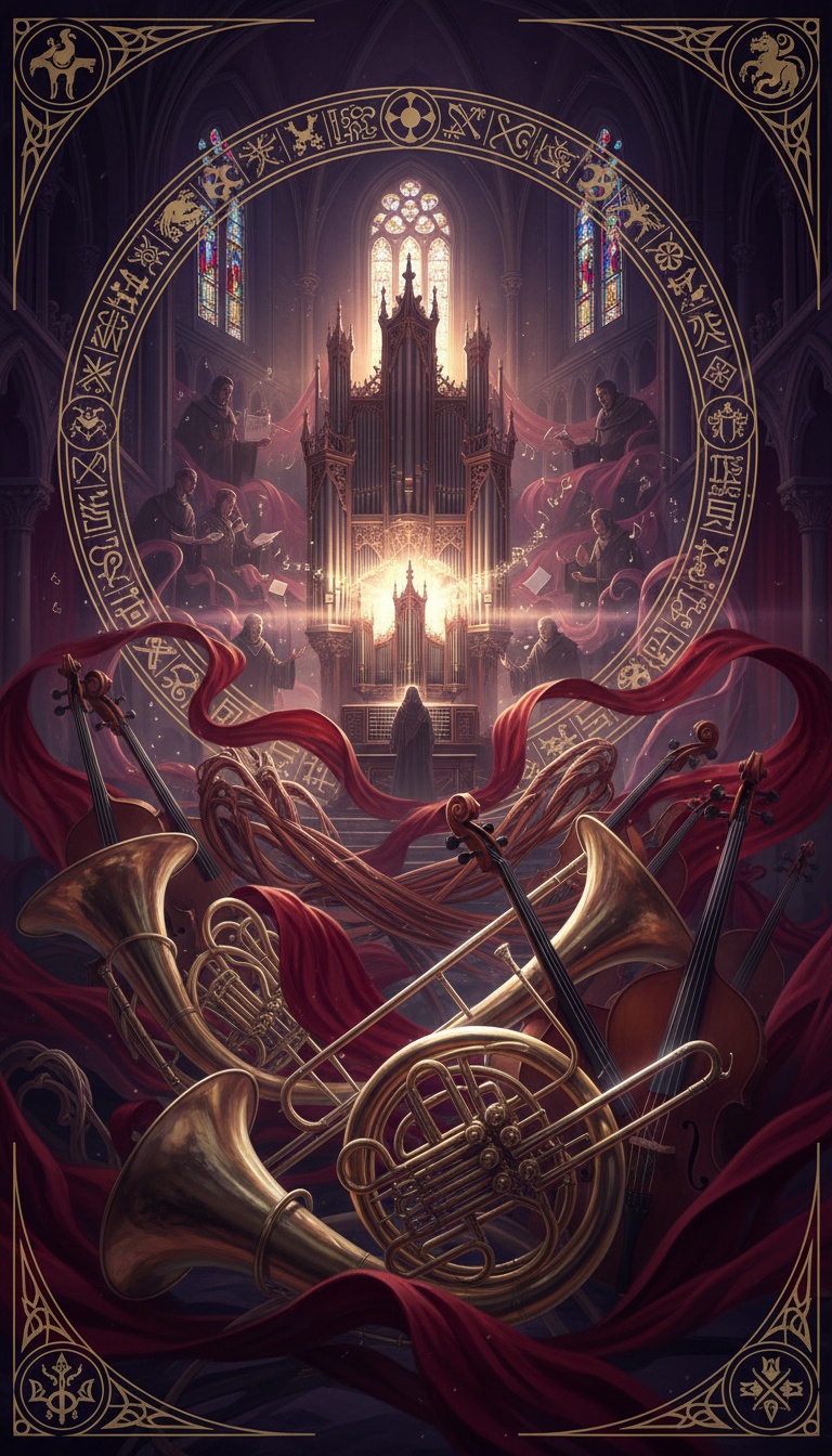 orchestral; rich layers of strings and brass, church organ resonating through vast spaces, melancholic undertones, dark fantasy, epic, orchestral, haunting gregorian chanting