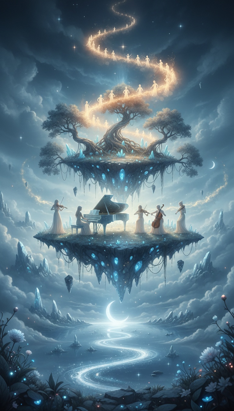 ethereal, haunting, orchestral with delicate strings and soft piano; layered with subtle choral harmonies and an otherworldly ambiance, anime