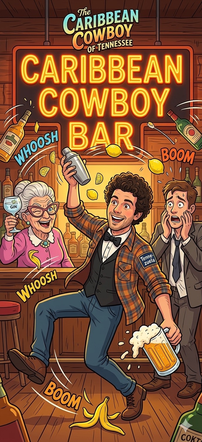 Zany Bluegrass-Salsa Fusion, Cartoon Novelty, High-Octane Banjo, Pedal Point Bass in Bridge, Rotational Panning, Honky-Tonk Piano, Comedic Sound Effects (Slide Whistle, Honk, Glass Shatter), Fast Tempo 160 BPM, Male Baritone with Venezuelan Accent, Orchestral Hits